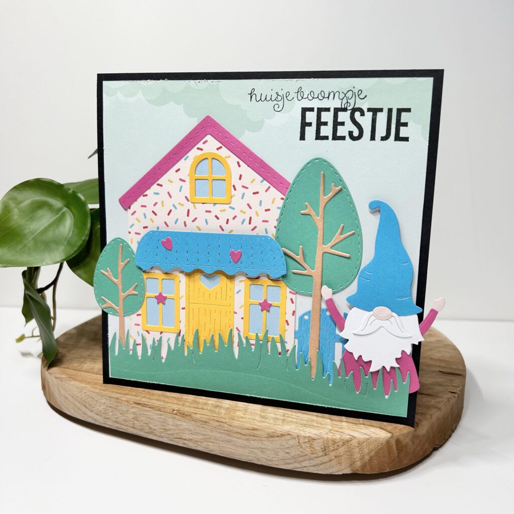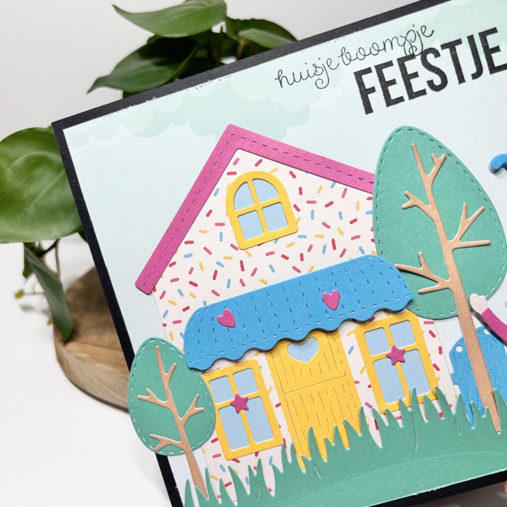 Onderstaand kaartje is gemaakt door Jolanda. Ze heeft er een kleurrijke kaart van gemaakt met Carlos in de hoofdrol. Carlos is maar wat blij met zijn nieuwe snoephuisje. De bomen, het gras en de stempel komen ook allemaal uit deze nieuwe release. Alle felle kleuren komen uit het paperpad bright van Studio Light. Door 4 kleuren steeds terug te laten komen op haar kaart is het een vrolijk geheel geworden. Wie wil nou niet verrast worden met een huisje, boompje, feestje kaart?