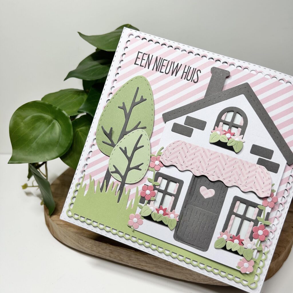 Onderstaand kaartje is gemaakt door Gerlinde. Voor de basis heeft Gerlinde de nested squares van craftlab gebruikt. Het mooie designpapier is het nieuwe paperpad Moo-rvelous. Zo zie je dat je dit paperpad niet alleen voor koeienkaartjes hoeft te gebruiken. Het huis krijgt een sjieke uitstraling door het dak, de deur, kozijnen en bakstenen uit één effen kleur te stansen. Ook Gerlinde heeft op haar kaart de nieuwe bomen en grasrand gebruikt. De leuke bloemen op de vensterbank komen uit de shadowbox van Craftlab.