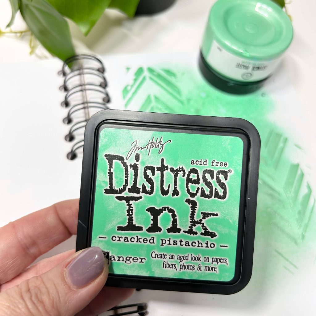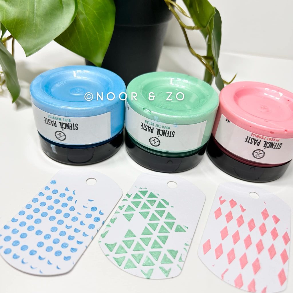 Jolanda heeft met distress inkt eerst een achtergrond gemaakt op beide pagina’s. Over deze achtergrond heeft Jolanda nog een patroon gemaakt met een mask uit de set ocean calling van Dutch Doobadoo en de stencilpasta van Art by Marlene. In deze set van Marlene zitten 3 kleuren pasta. Jolanda heeft voor jullie ook kleurenkaartjes gemaakt zodat jullie goed de verschillende kleuren kunnen zien.