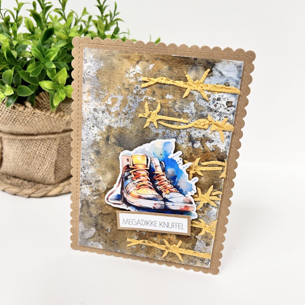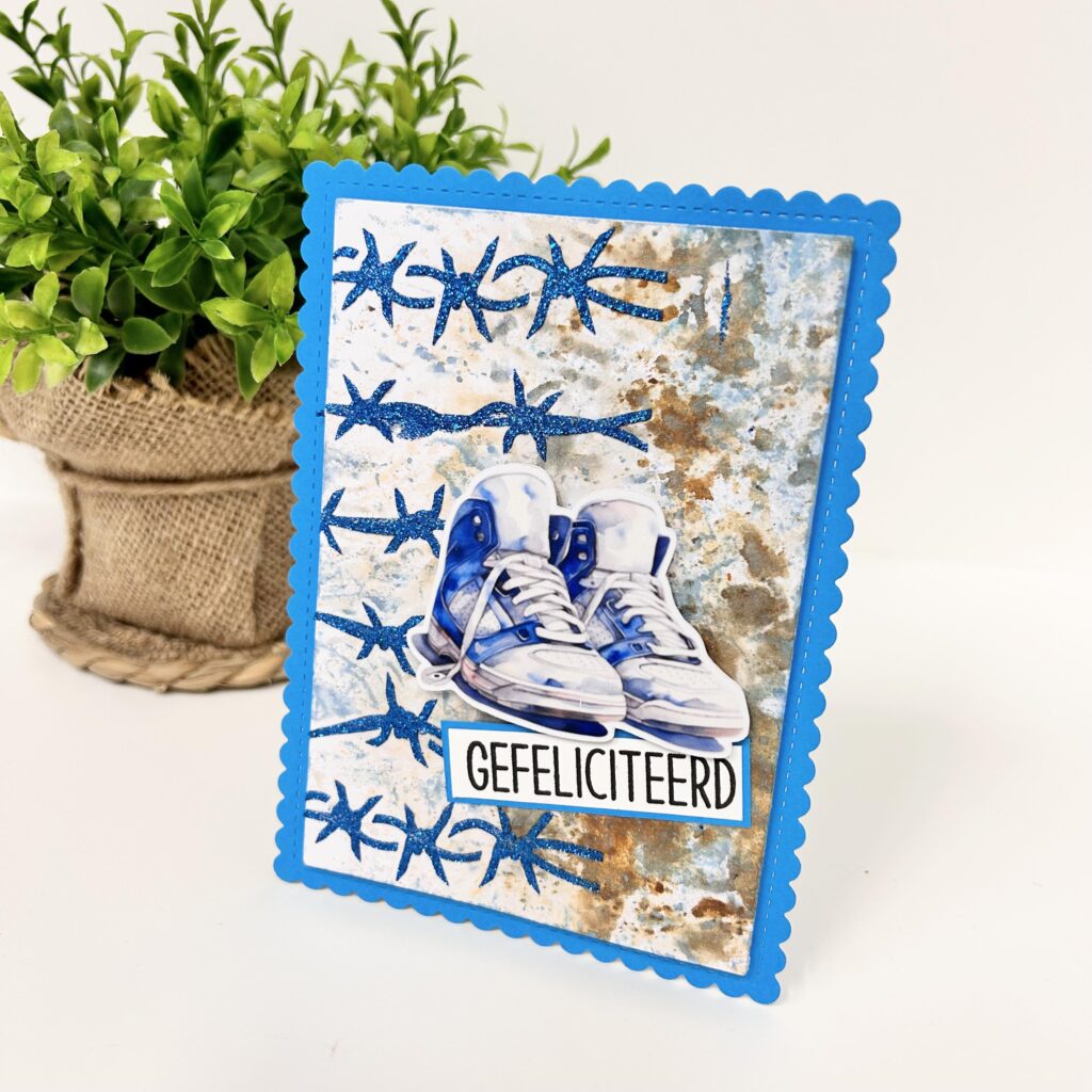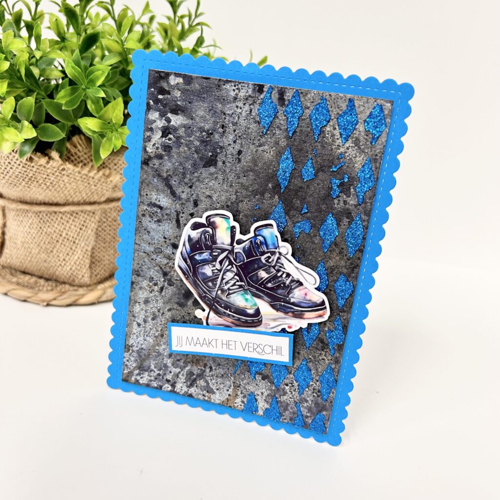 Karin heeft voor haar kaarten de a6 mal van craftlab gebruikt. In de video legt Karin heel duidelijk uit hoe ze de achtergrondjes maakt. Door in een spraybox een kliedermatje te leggen en hier verschillende kleuren izink sprays in te sprayen en hier aquarelpapier op te deppen krijg je steeds verschillende achtergronden. Als de achtergrond droog is kun je deze nog met een mask en expanding mousse bewerken. De stoere sneaker plaatjes die Karin heeft gebruikt zijn van Bella Lulu.