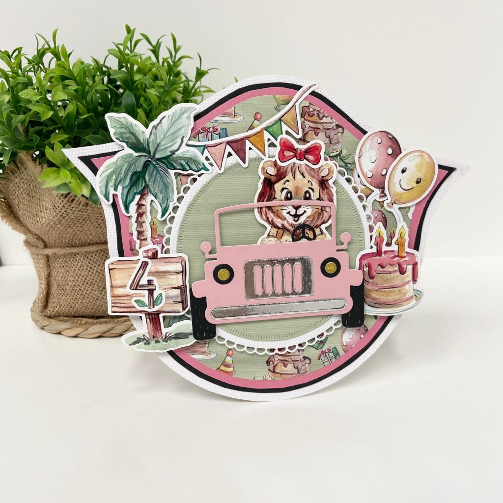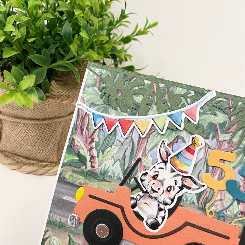 Zaterdag 8 april hadden wij het online feestje jungle party. Monique heeft onderstaand kaartje gemaakt met het papier uit deze goodiebag. Het is een leuke set met allemaal jungle prints die goed te combineren zijn met de stansen die in deze set zitten zoals de jeep en de jungle layout stans van Craftlab.