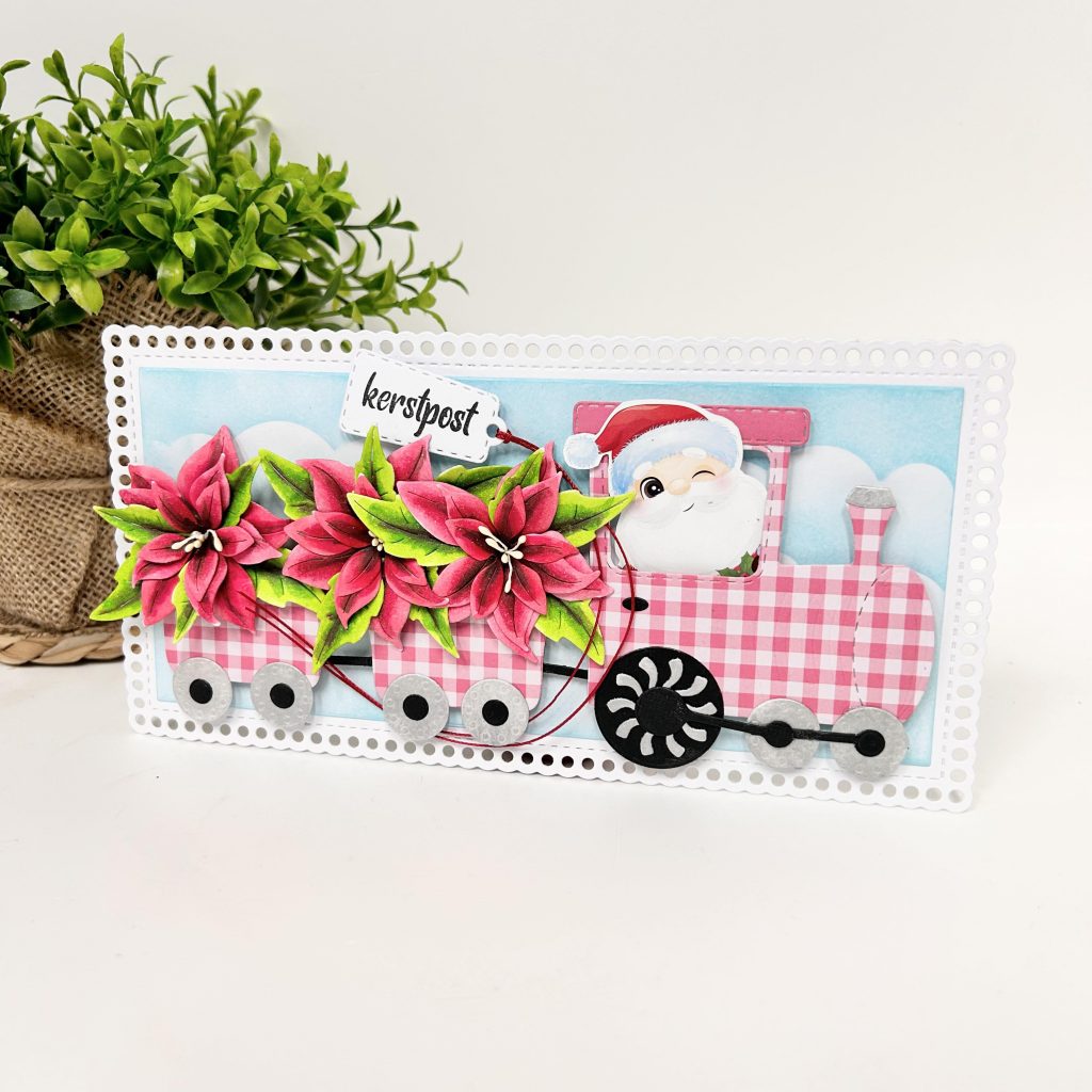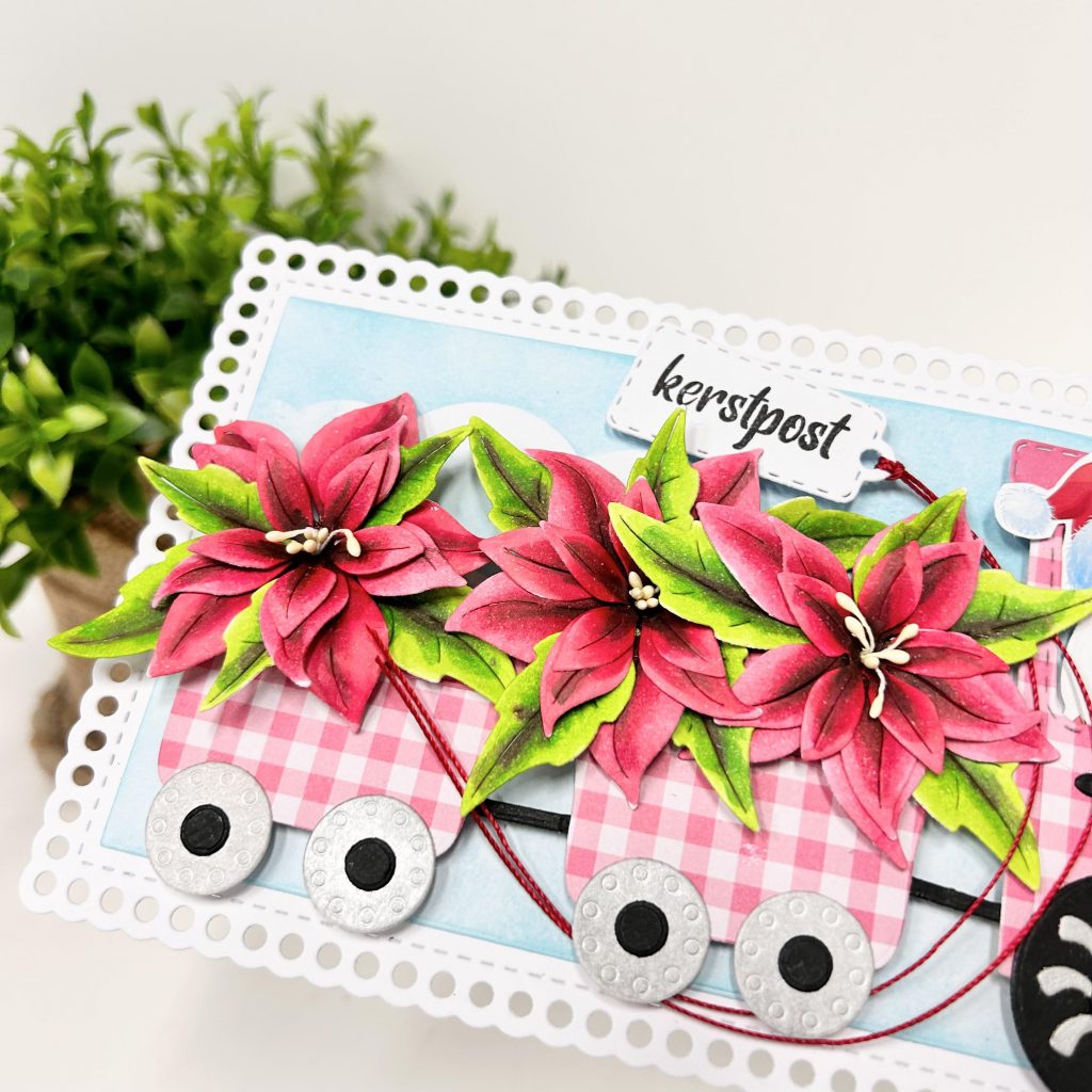 Corry heeft de poinsettia’s na het kleuren in de wagonnetjes van de trein gezet. Op de achtergrond heeft ze met inkt een wolken achtergrond gemaakt. De kerstman die de trein bestuurt komt uit het Bella Lulu knipvel kerstkadootjes. Hier staan nog meer leuke kerstfiguurtjes op.
