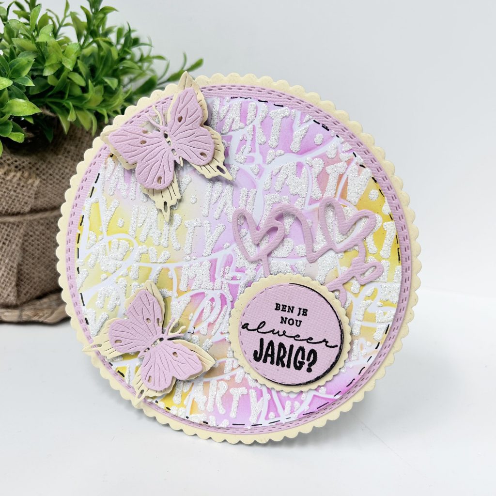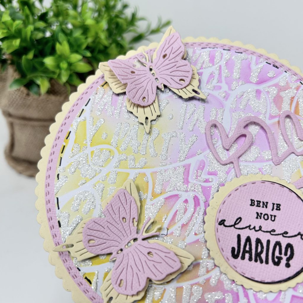 Joyce heeft weer een live gegeven afgelopen week en is aan de slag gegaan met inkt, structuurpasta en glitter embossingpoeder. Hierbij heeft ze een stans & mask stencil uit de Studio Light grunge collectie gebruikt.