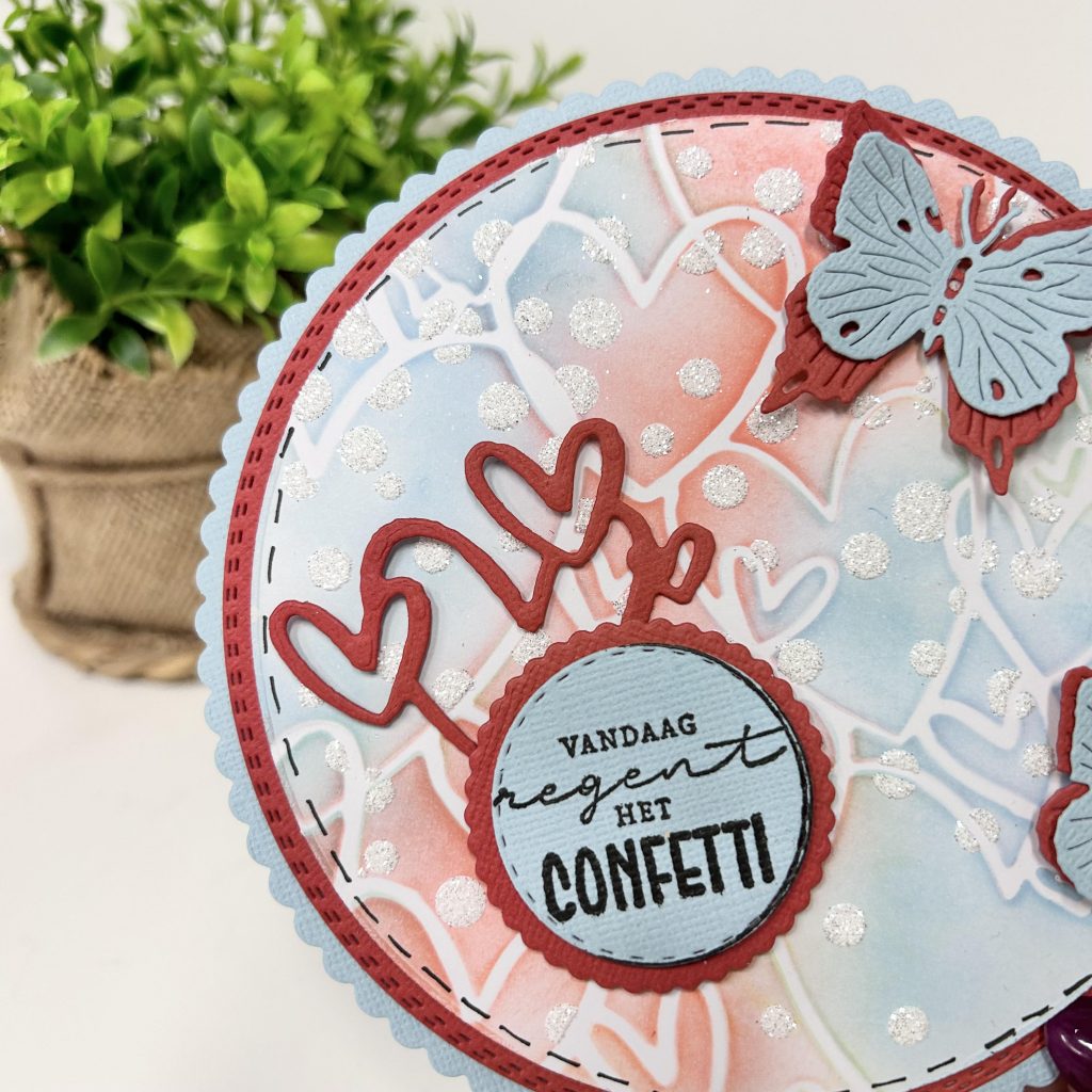 Ze heeft uit stempelpapier een cirkel gestanst met de nieuwe Craftlab nested circles set in het grootste formaat. Hierop heeft ze het mask met de harten gelegd en is met 2 kleuren inkt over het mask gegaan.Zo komt het hartpatroon zichtbaar op je stempelpapier.