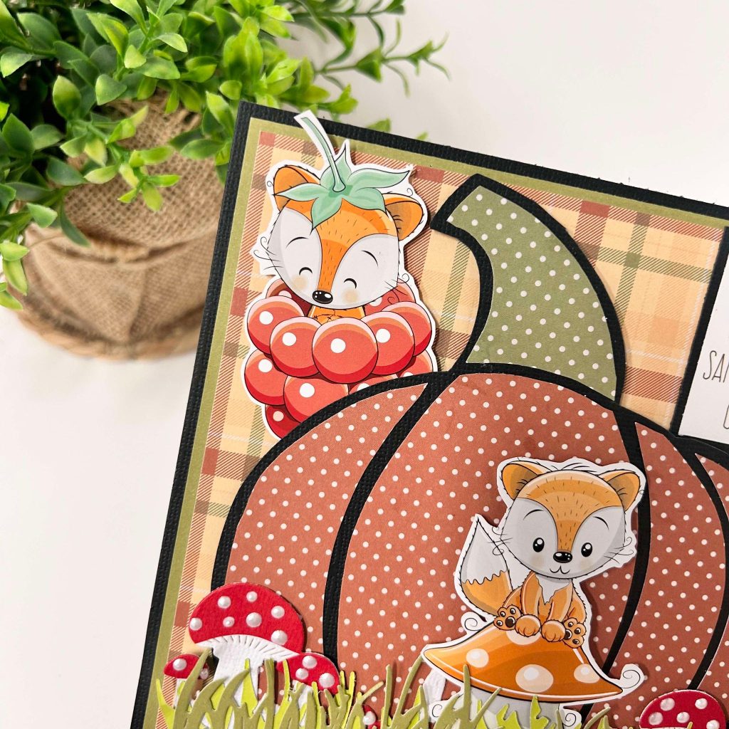 Voor de basis van onderstaand kaartje heeft Claudia een vierkante kaart gesneden uit zwart cardstock van Bella Lulu. De pompoen op Claudia haar kaart is een craftstencil van Marianne Design net als het grasrandje. De leuke plaatjes komen uit een herfst knipvel van Bella Lulu en dit knipvel is alleen nog maar verkrijgbaar in deze kit falling leaves.