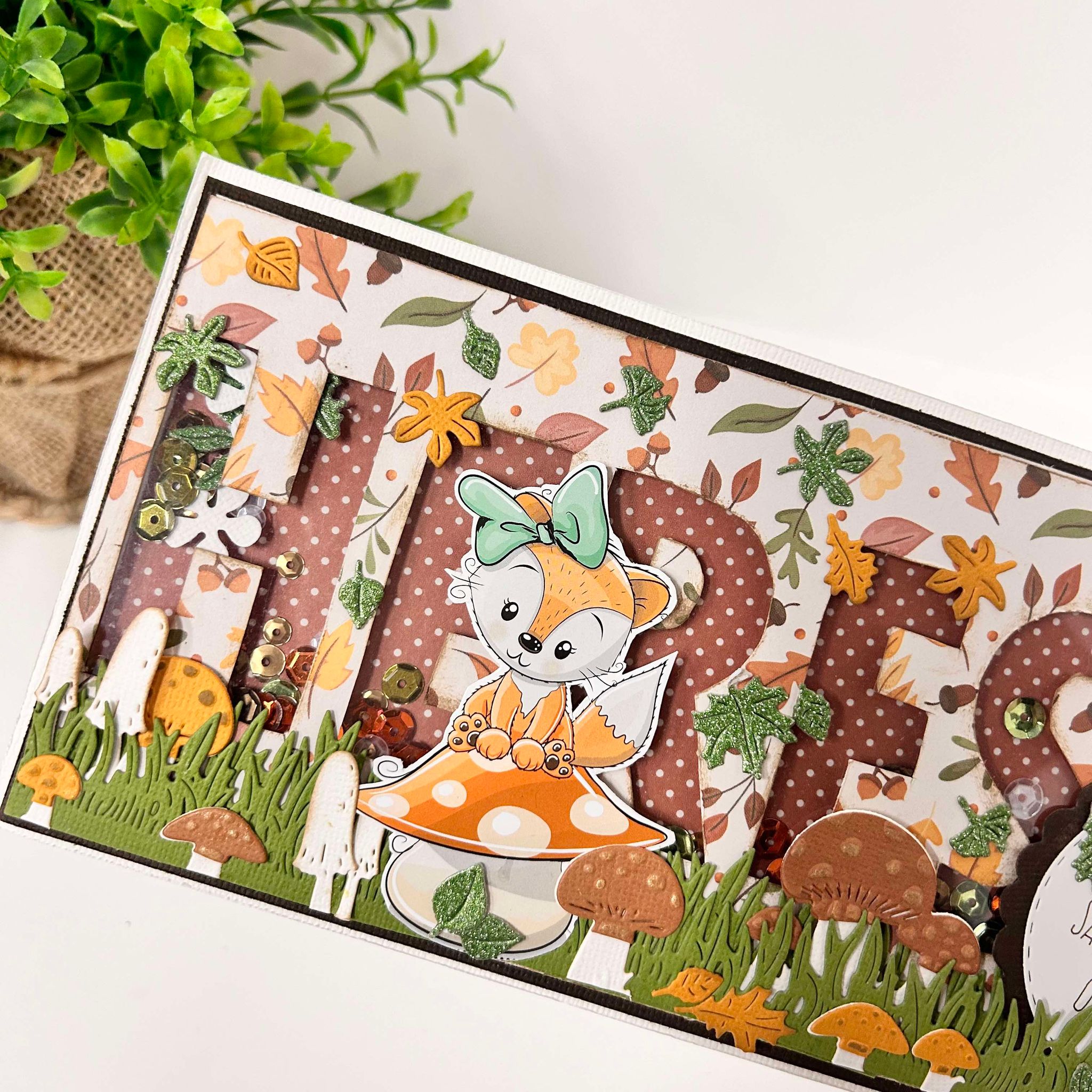 In de kit zit behalve designpapier en een Bella Lulu knipvel ook deze tekenmal van Dutch Doobadoo en een stansmal met paddenstoelen die Claudia allemaal op onderstaand kaartje heeft gebruikt. De tekst Herfst heeft ze uitgesneden en hier een schudkaartje mee gemaakt.