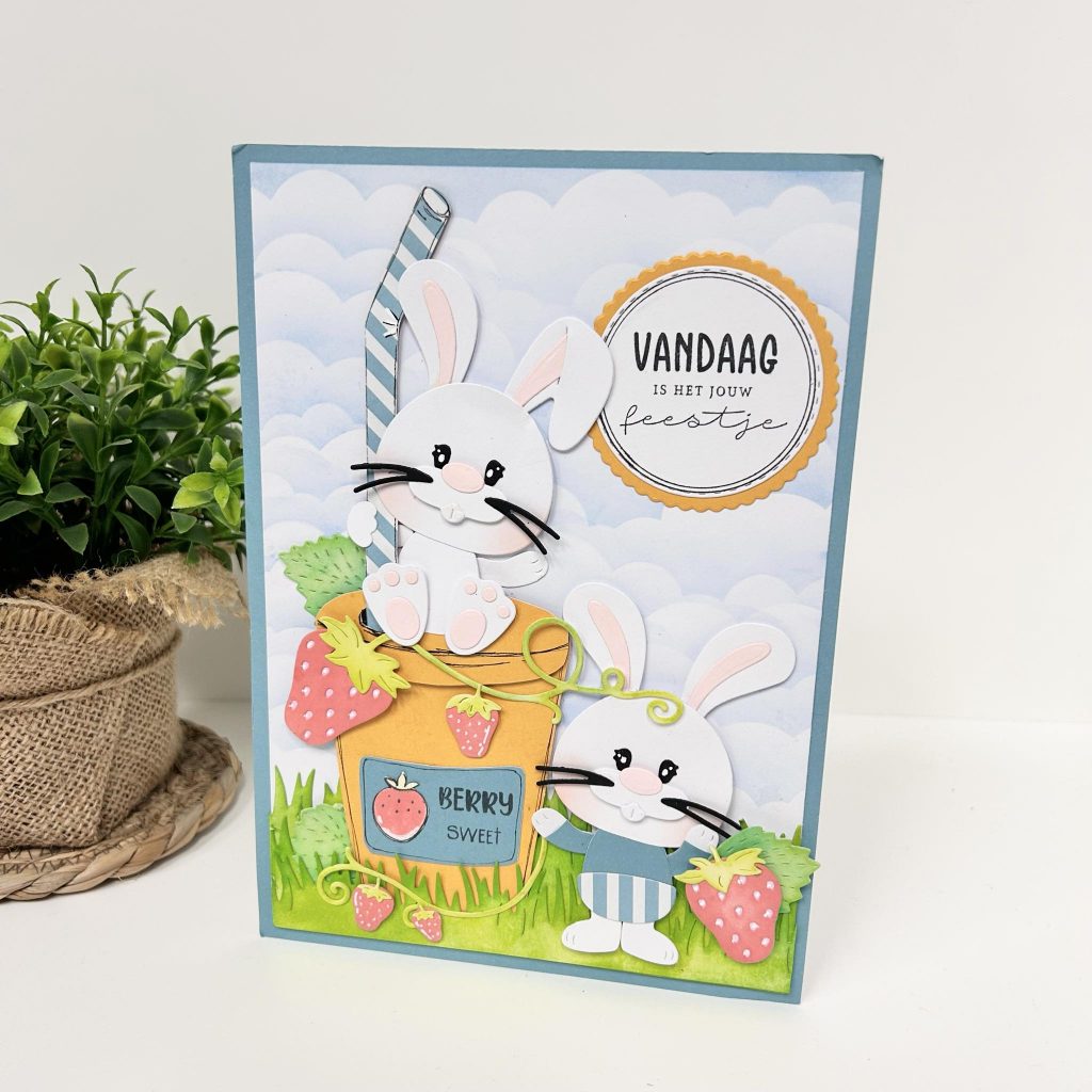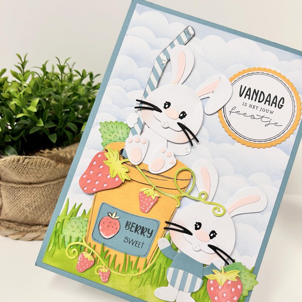 In de build-up mal van de hamburger zit ook een milkshake beker die je natuurlijk op verschillende manieren kunt gebruiken. Judith heeft er een lekkere aardbeien mikshake van gemaakt. Benjamin heeft zelf de aardbeitjes geplukt in de tuin. Kijk ze eens samen genieten! De grasrand heeft Judith gemaakt met de borderz mal van CraftLab. De tekst Berry Sweet is ook van CraftLab en is natuurlijk weer heel leuk in combinatie met deze overheerlijke aardbeien milkshake.