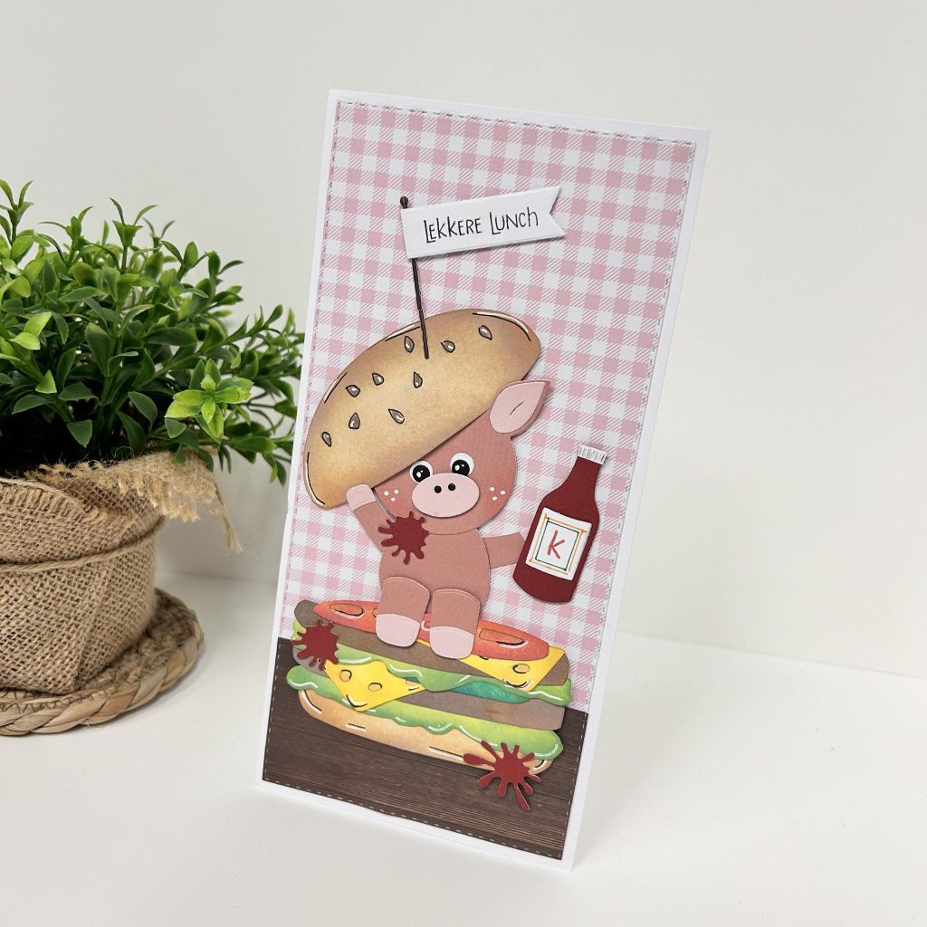 Voor de basis van onderstaand kaartje heeft Judith een Slimline mal van CraftLab gebruikt. Het roze designpapier komt uit het paperpad Moor-velous. De build-up hamburger van Dutch Doobadoo heeft Judith met behulp van de tekenmal getekend en uitgeknipt en daarna op kleur gebracht met inkt. Vind je het moeilijk om te inkten dan kun je de hamburger ook knippen uit designpapier. De hamburger kun je zelf verder opbouwen met blaadjes sla, tomaat en kaas. Frenkie brengt de hamburger nog lekker op smaak met ketchup. Het flesje ketchup heeft Judith gemaakt met het nieuwe bierflesje van CraftLab. De tekst lekkere lunch komt uit de stempelset tegoedbon van CraftLab. De hamburger shop je nu nog met 50% korting zolang de voorraad strekt.