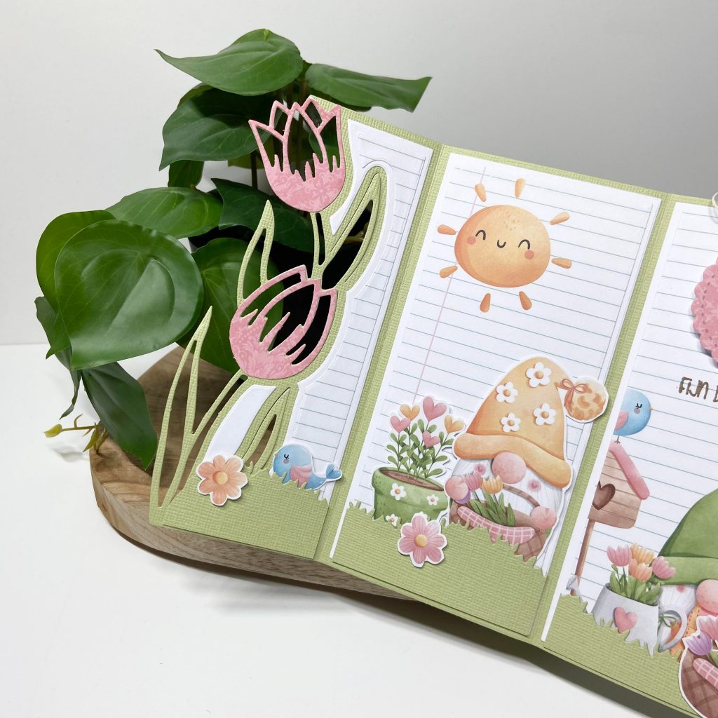 Monica heeft voor de basis van dit kaartje de Dutch Doobadoo shape srt Priscilla gebruikt. Op haar kaartje heeft ze de nieuwste Build Up Auto van Dutch Doobadoo gebruikt en hier de gnomies uit de papierset Lente in de lucht gezet.