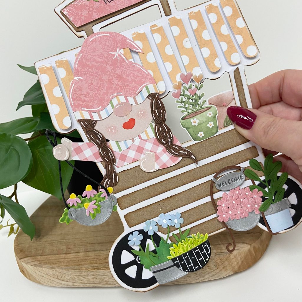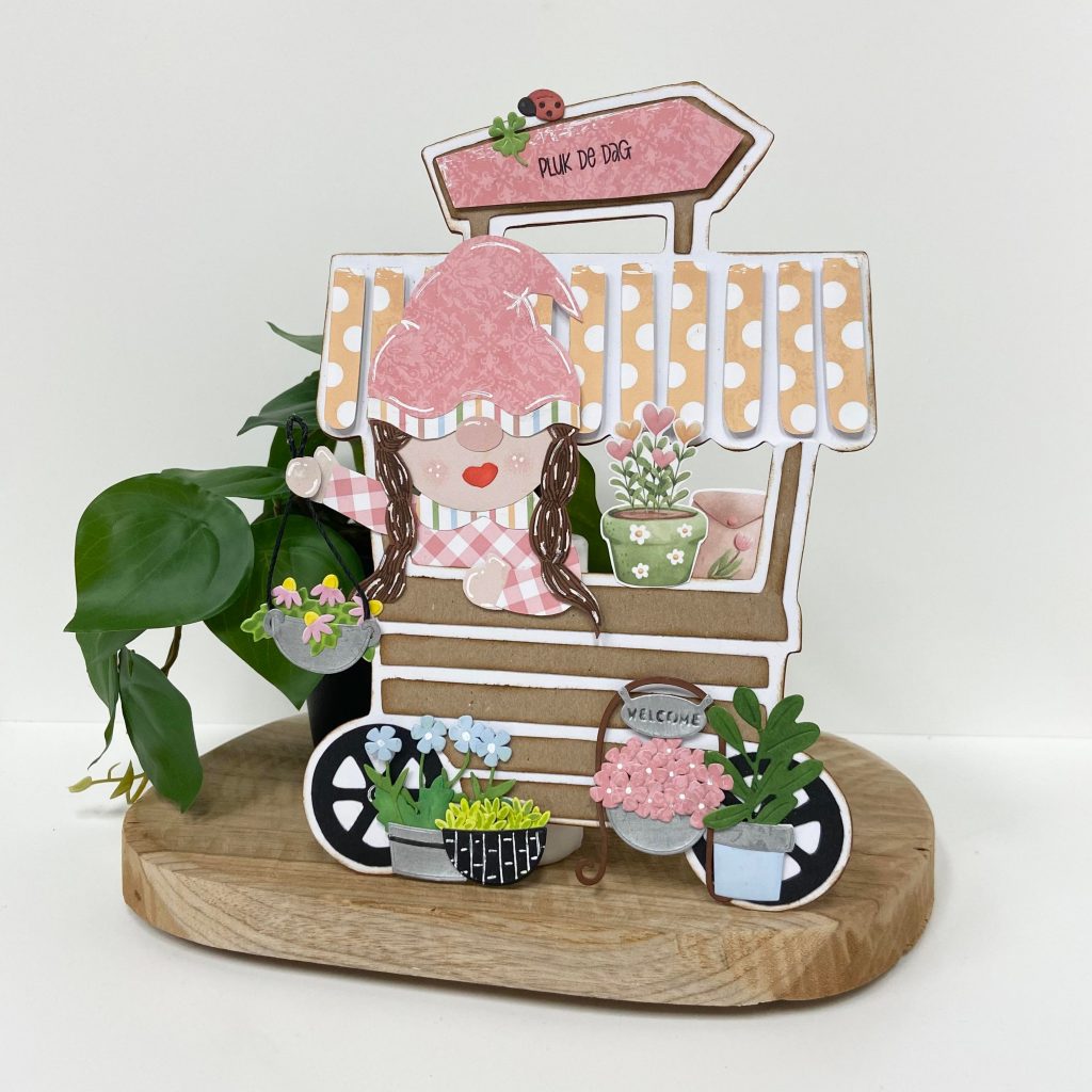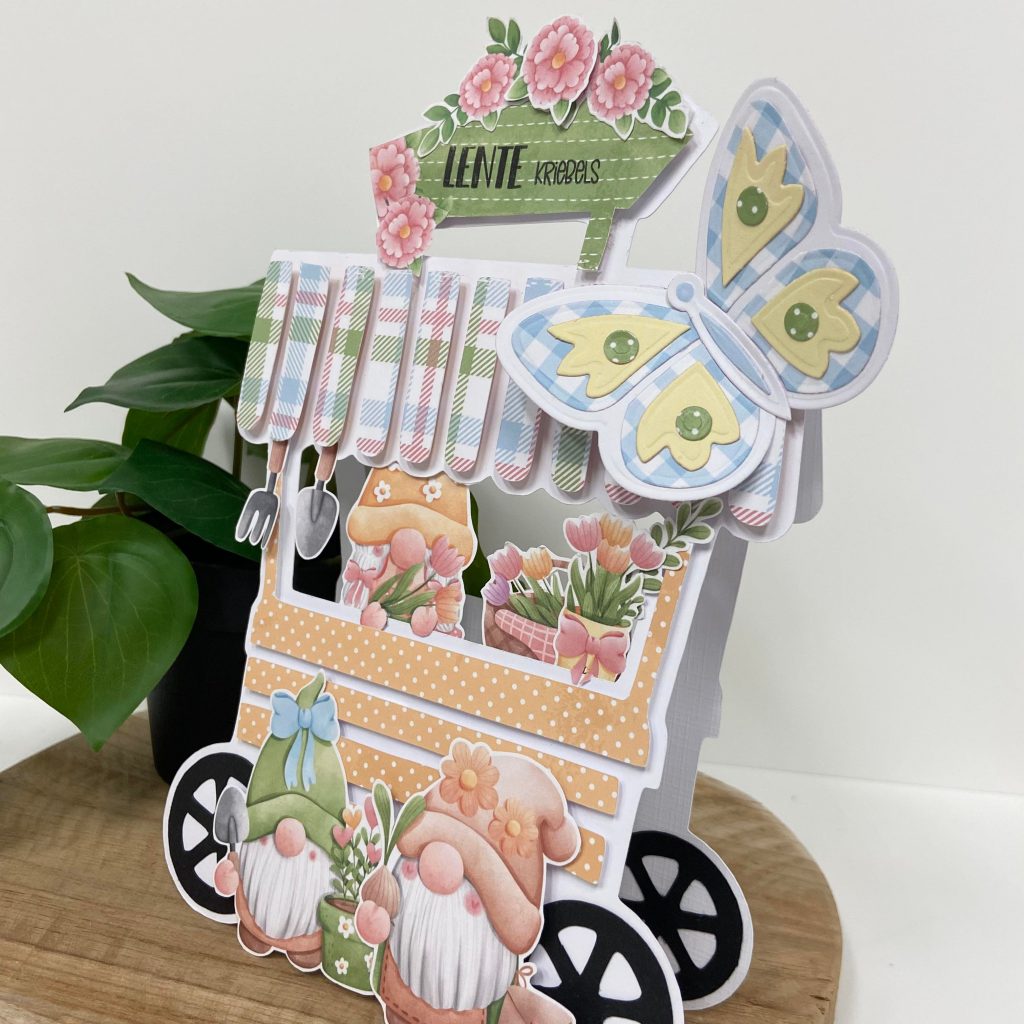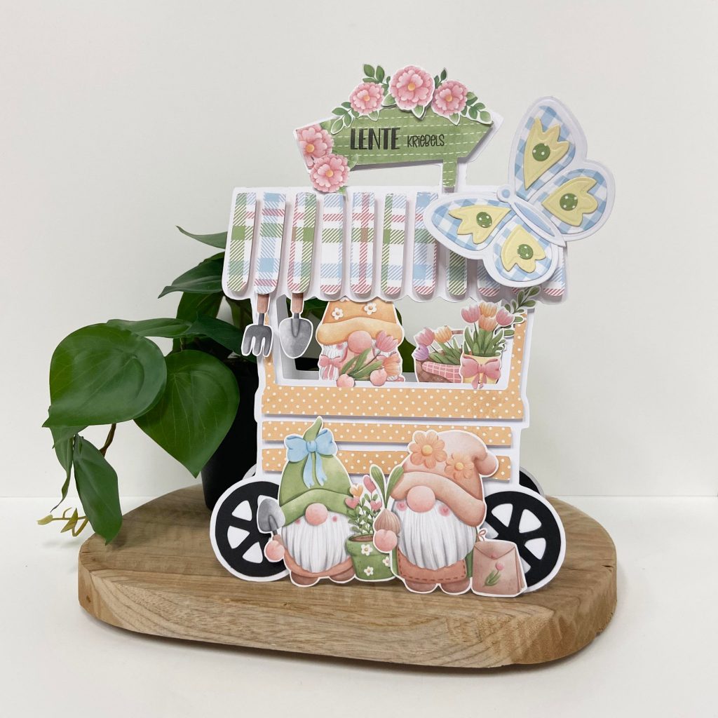 De gnooms hebben alweer last van lentekriebels en zijn dus in hun kraampje gezellige voorjaarsbloemetjes aan het verkopen. De gnomes en het papier komen uit de Bella Lulu papierset Lente in de lucht.