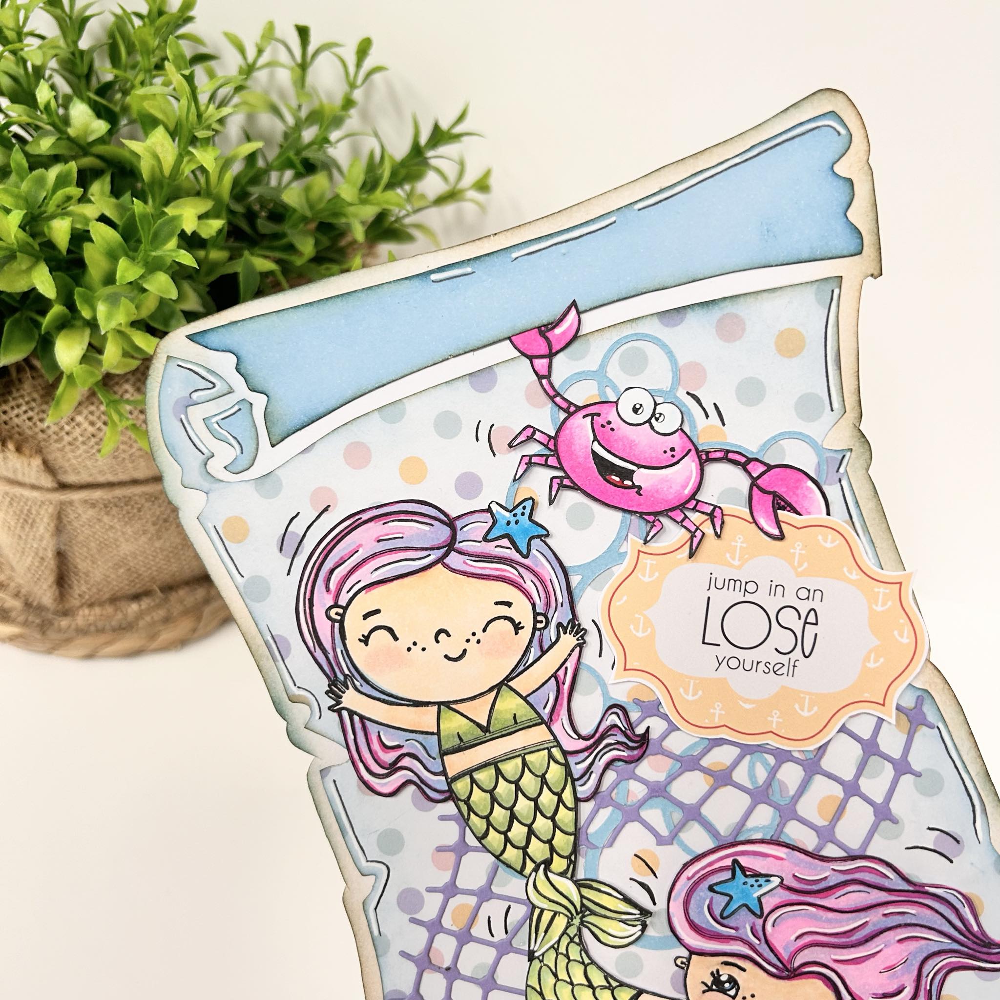 Het is ook altijd leuk om oudere mallen van Dutch Doobadoo te gebruiken bij nieuwe collecties. Want deze card art schatkaart past natuurlijk perfect bij het thema van deze maand. En die scharen van Leonard de krab komen goed van pas want hij kan nu zowel de schatkaart als de tekst vasthouden. Ook de 2 zeemeerminnen hebben een plekje gekregen op de schatkaart. Het visnet is een oudere mal van Marianne Design en de tekst jump in an lose yourself komt uit de stansvellen die in de crafty kit zitten.