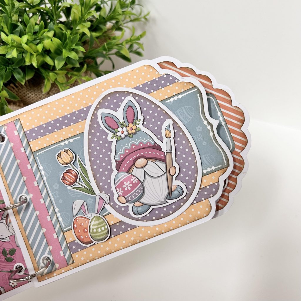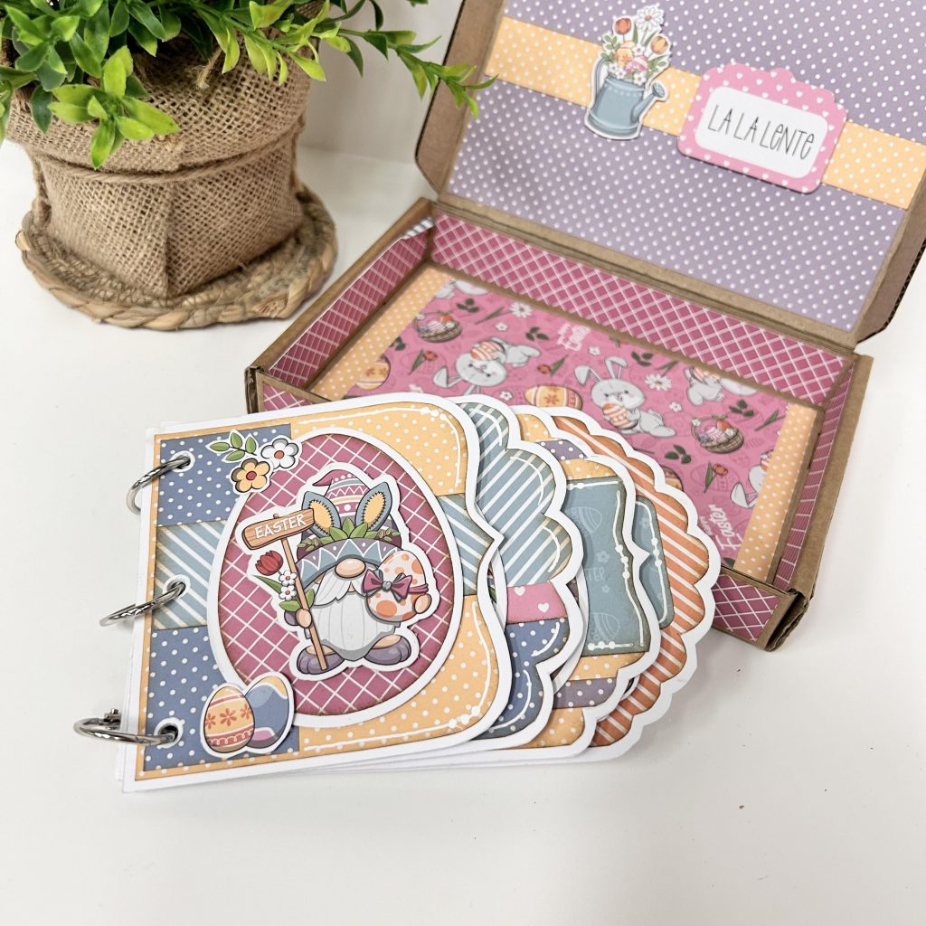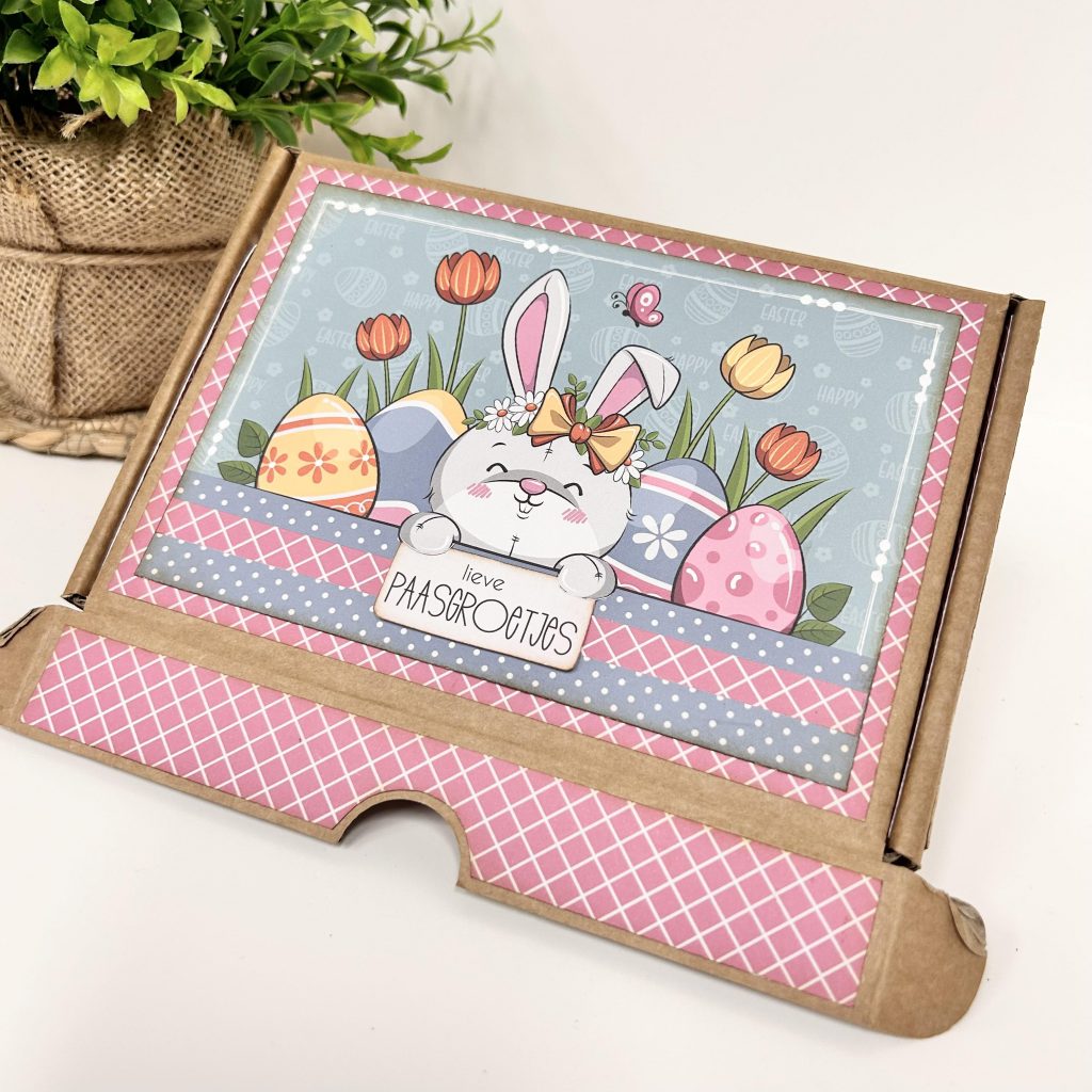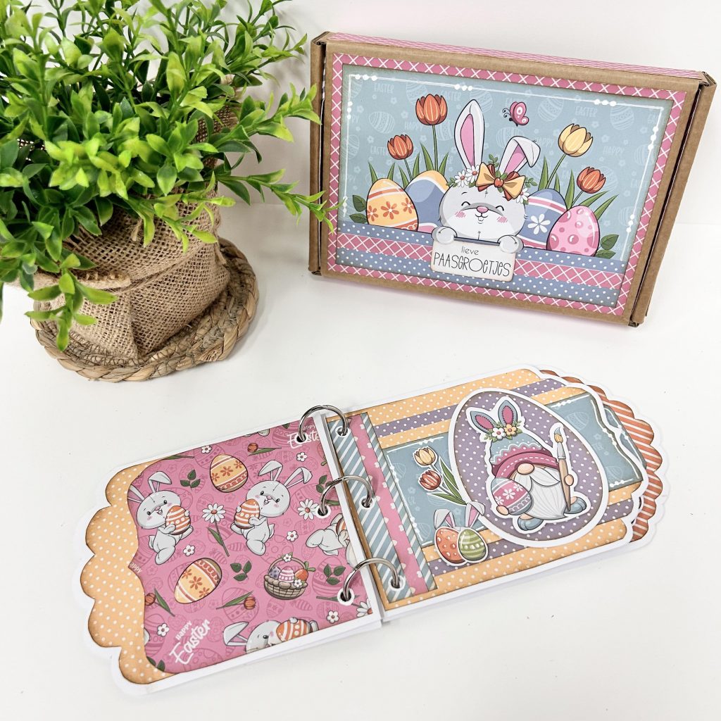 Ook de binnenkant van de box heeft Ria gepimpt met het vrolijke papier uit de crafty kit vrolijk voorjaar. Al die leuke pasteltinten passen perfect bij elkaar. En zoals je ziet kun je nog meerdere pagina’s toevoegen aan je album want er is genoeg ruimte in de box. Je kunt er zelfs nog een klein cadeautje aan toevoegen.