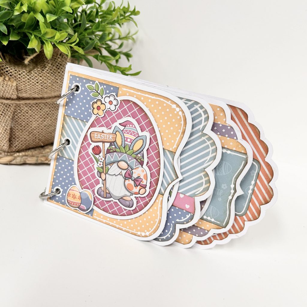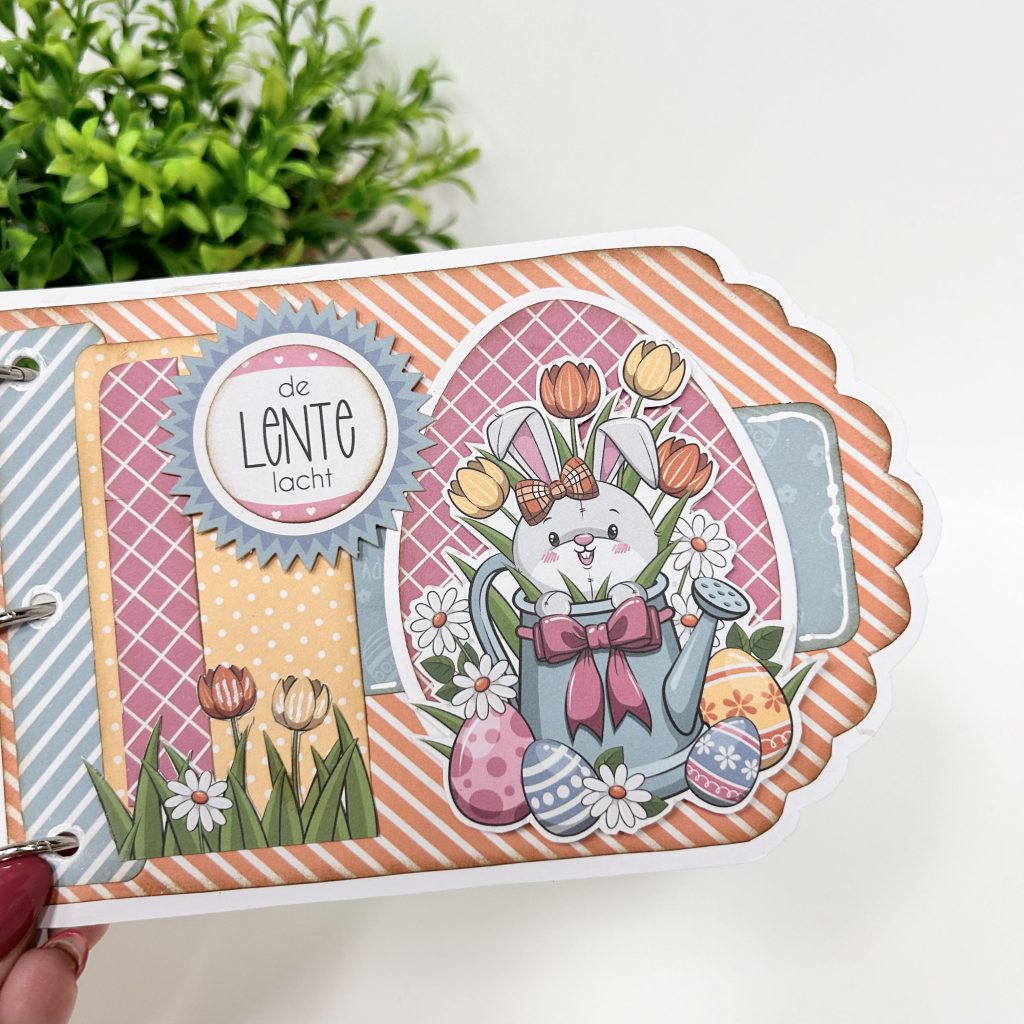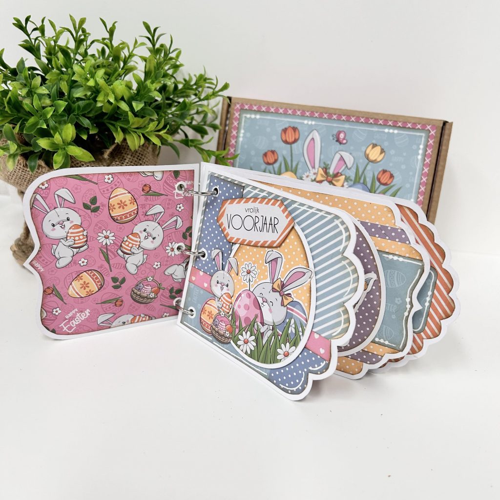 De teksten die Ria heeft gebruikt komen ook uit de crafty kit. In deze set zitten behalve een card art en designpapier ook nog 3 stansvellen met plaatjes en teksten. Zo een cadeautje wil iedereen toch ontvangen. Het album hoef je natuurlijk niet alleen voor Pasen te maken maar is ook leuk voor een geboorte cadeautje of voor een bruiloft. Je kan het album met box in alle thema’s maken.
