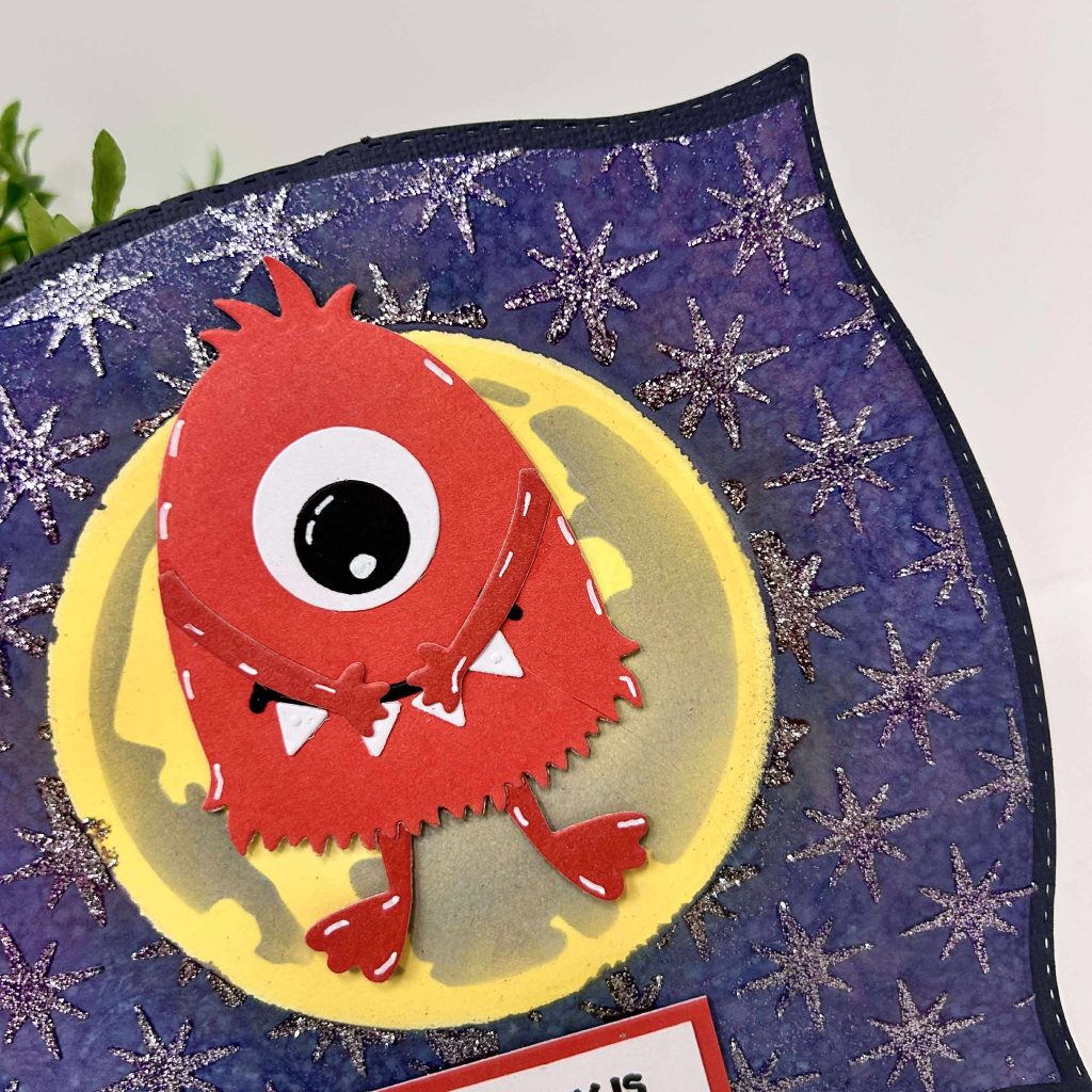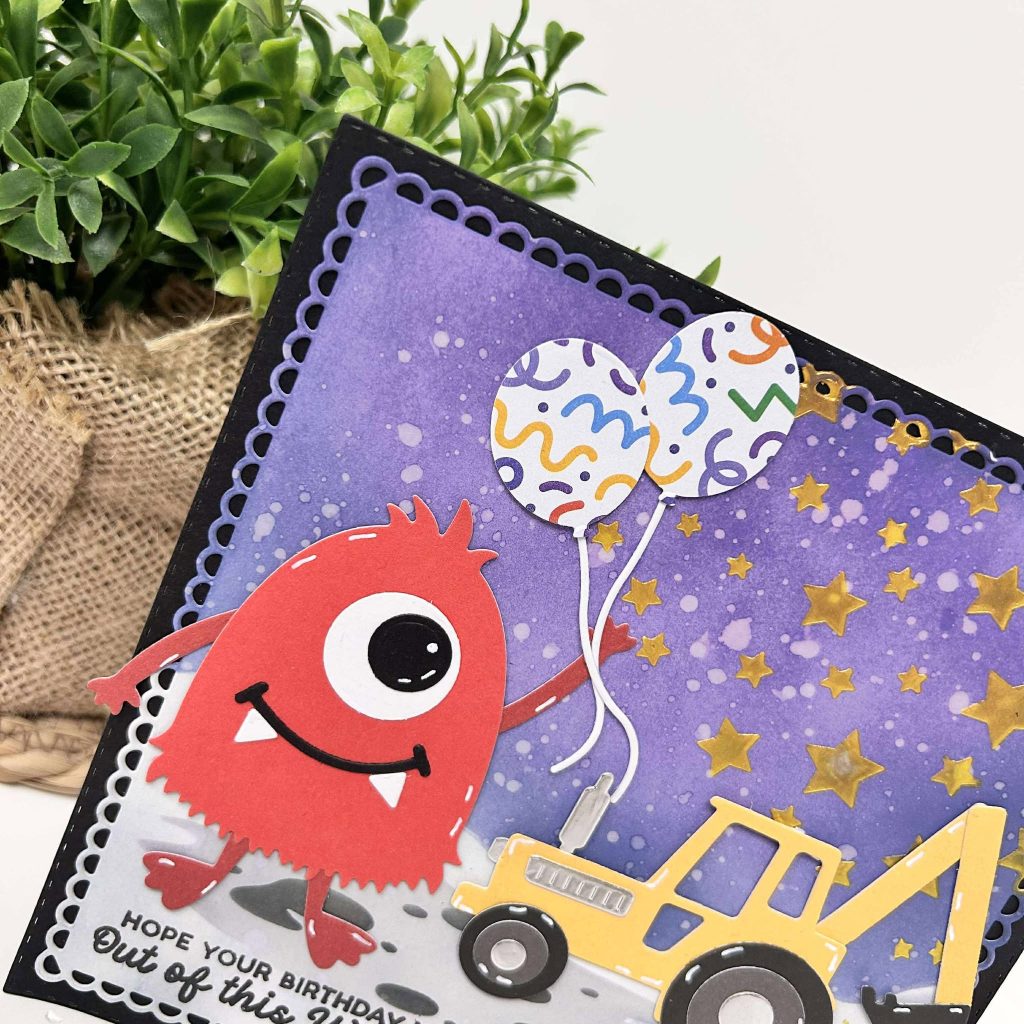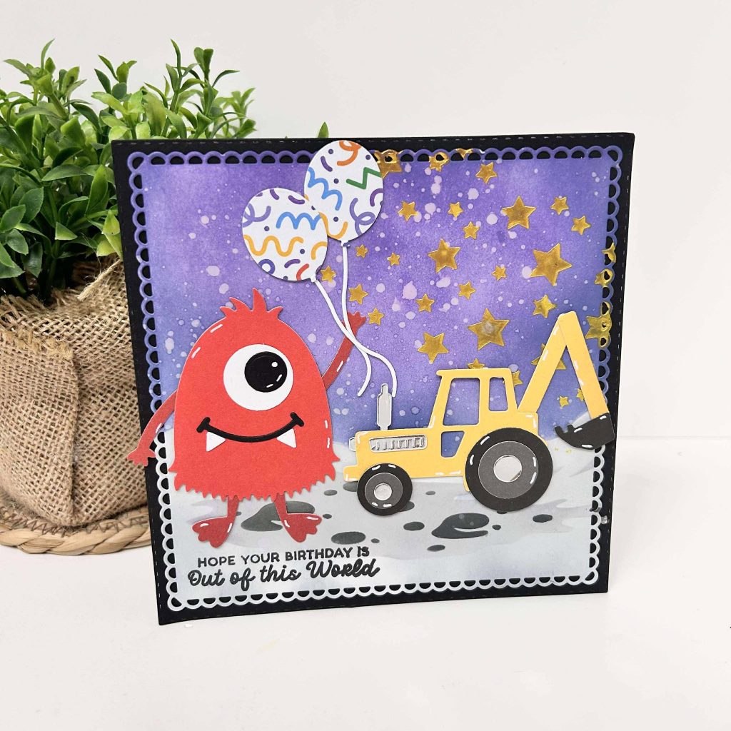 Welke klein monstertje is niet gek op graafmachines? Ook deze stansmal zit in de Little Adventurer collectie. Ook op dit kaartje heeft Monica zelf een achtergrond gemaakt met verschillende techniekjes. Ze heeft behalve spray’s en inkt ook Lunar pasta gebruikt. Het leuke maanlandschap is een stencil van Carlijn Design.