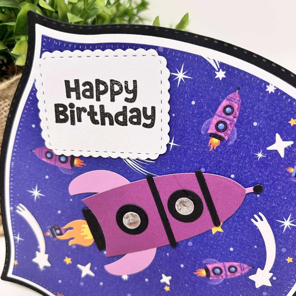 De stansmal Space Traveller past weer perfect bij het designpapier en deze twee heeft Monica ook gecombineerd op haar kaartje. Behalve een tekst heeft het kaartje niet meer nodig. De tekst heeft Monica gestempeld op de handige labels van CraftLab.