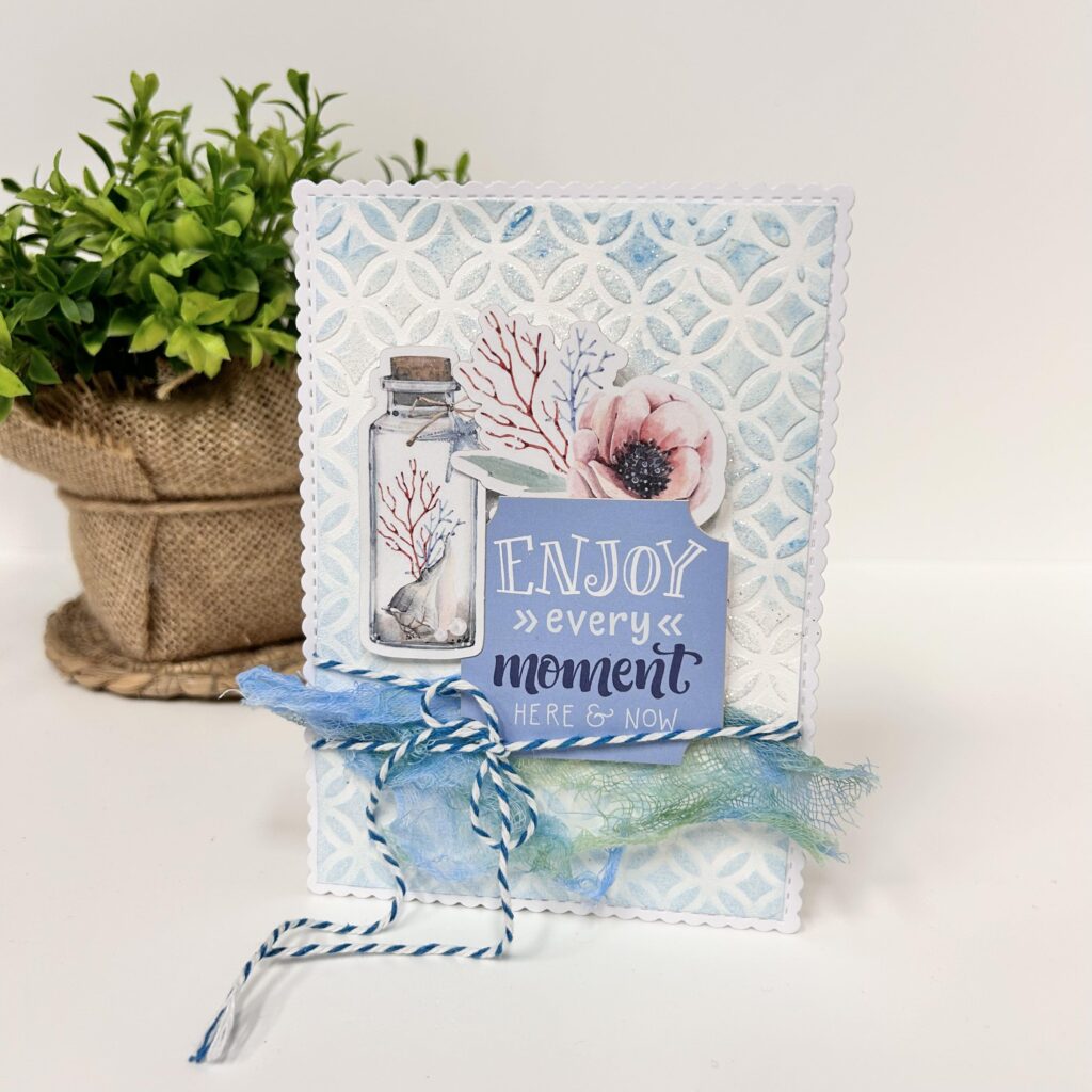 Voor onderstaande kaartjes heeft Corry de mask art planner set ocean calling gebruikt. In deze set zitten die verschillende mask arts die je op verschillende manieren op je kaart kunt gebruiken. In de video hieronder laat Corry een aantal leuke techniekjes zien. Voor het eerste kaartje heeft Corry het mask art als stempel gebruikt en dit met verschillende kleuren inkt bewerkt. Corry werkt op haar mixed media projecten graag met verbandgaas. In de video laat Corry zien dat je dit verbandgaas ook leuk op kleur kunt brengen met inkt. De teksten op het eerste kaartje komen uit het nieuwe stansvel ocean calling teksten.