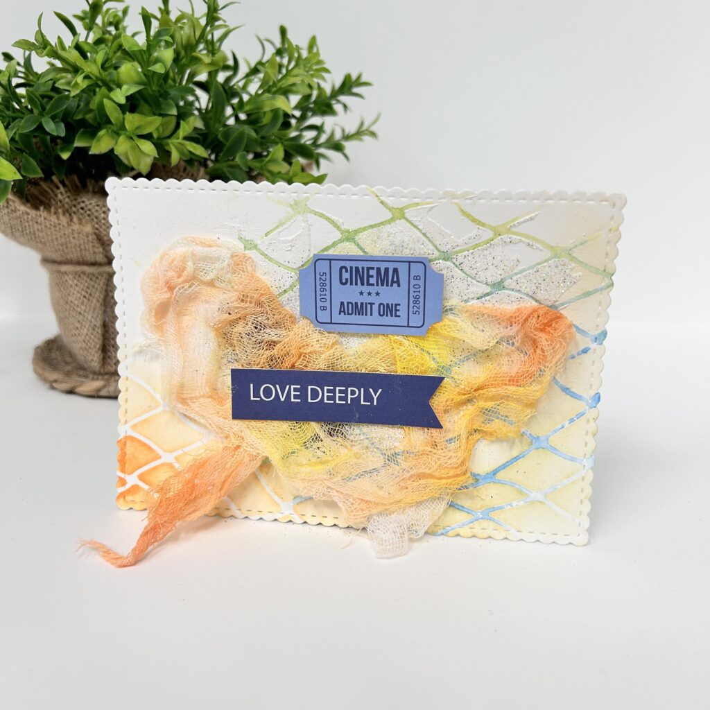 Op het tweede kaartje heeft Corry een ander mask gebruikt en dit bewerkt met structuurpasta en glitter. Zie je wat voor een mooi effect je krijgt door glitter op structuurpasta te strooien. De mooie plaatjes en teksten komen uit de twee nieuwe stansvellen. Ook op dit kaartje heeft Corry verbandgaas op kleur gebracht en verwerkt onder de tekst.