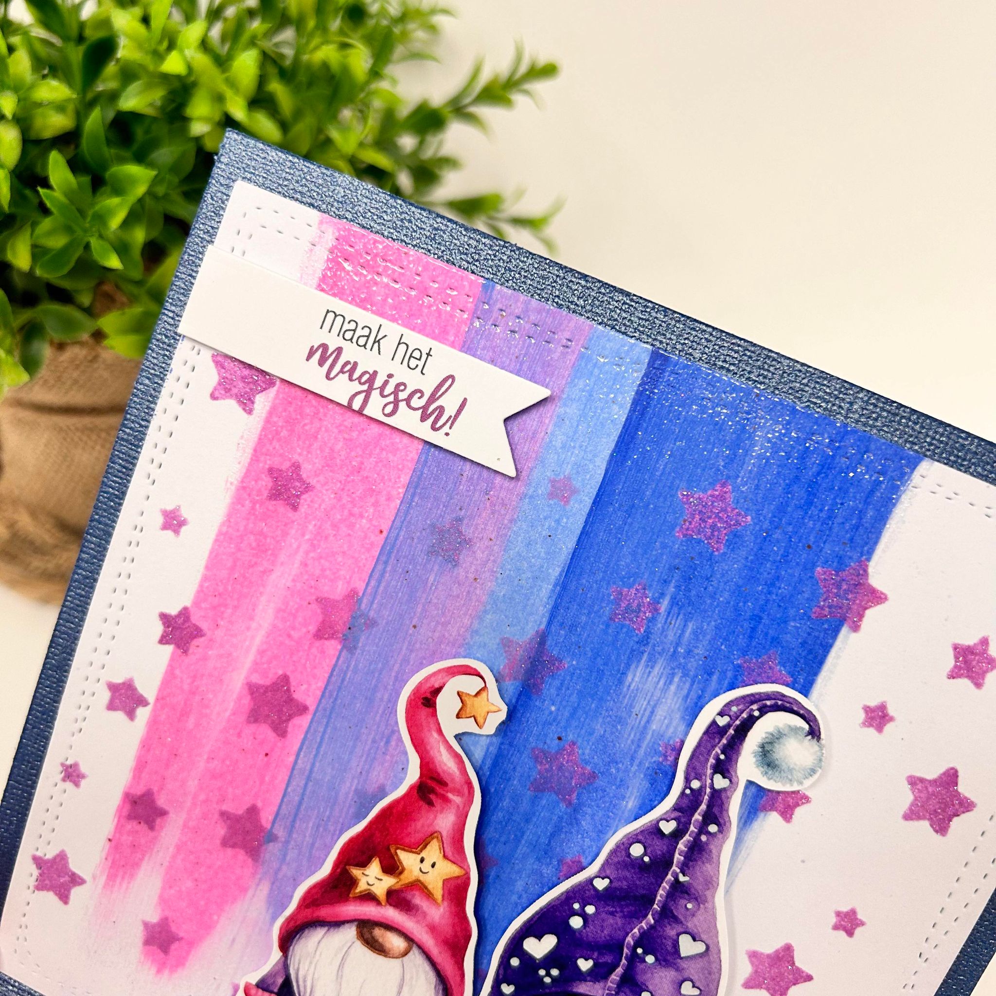 Voor de basis van onderstaand kaartje heeft Natalie de vierkante mal van CraftLab gebruikt. Voor de achtergrond heeft ze een sterretjes mask gebruikt en dit bewerkt met de pigment inkten. De leuke gnomes komen uit het knipvel magic gnomes van Bella Lulu.