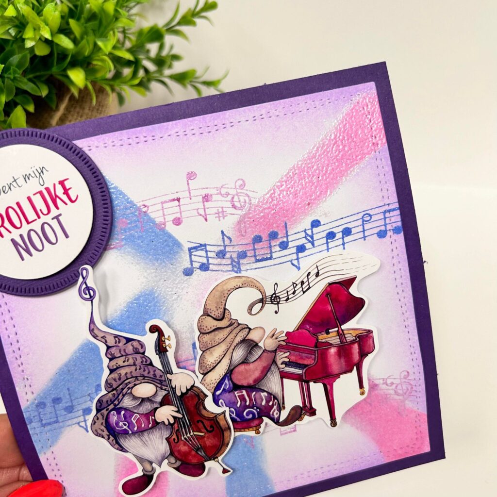 Voor het laatste muzikale kaartje heeft Natalie voor de achtegrond de stempel Festive Season van ECD gebruikt. De muzieknoten passen perfect bij de leuke muzikale gnomes van Bella Lulu. Door de kleuren inkt aan te passen aan het cardstock en de gnomes krijg je een mooi geheel.