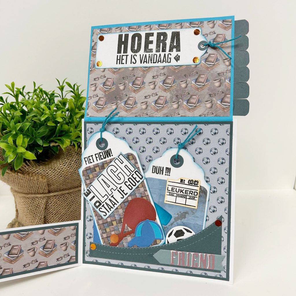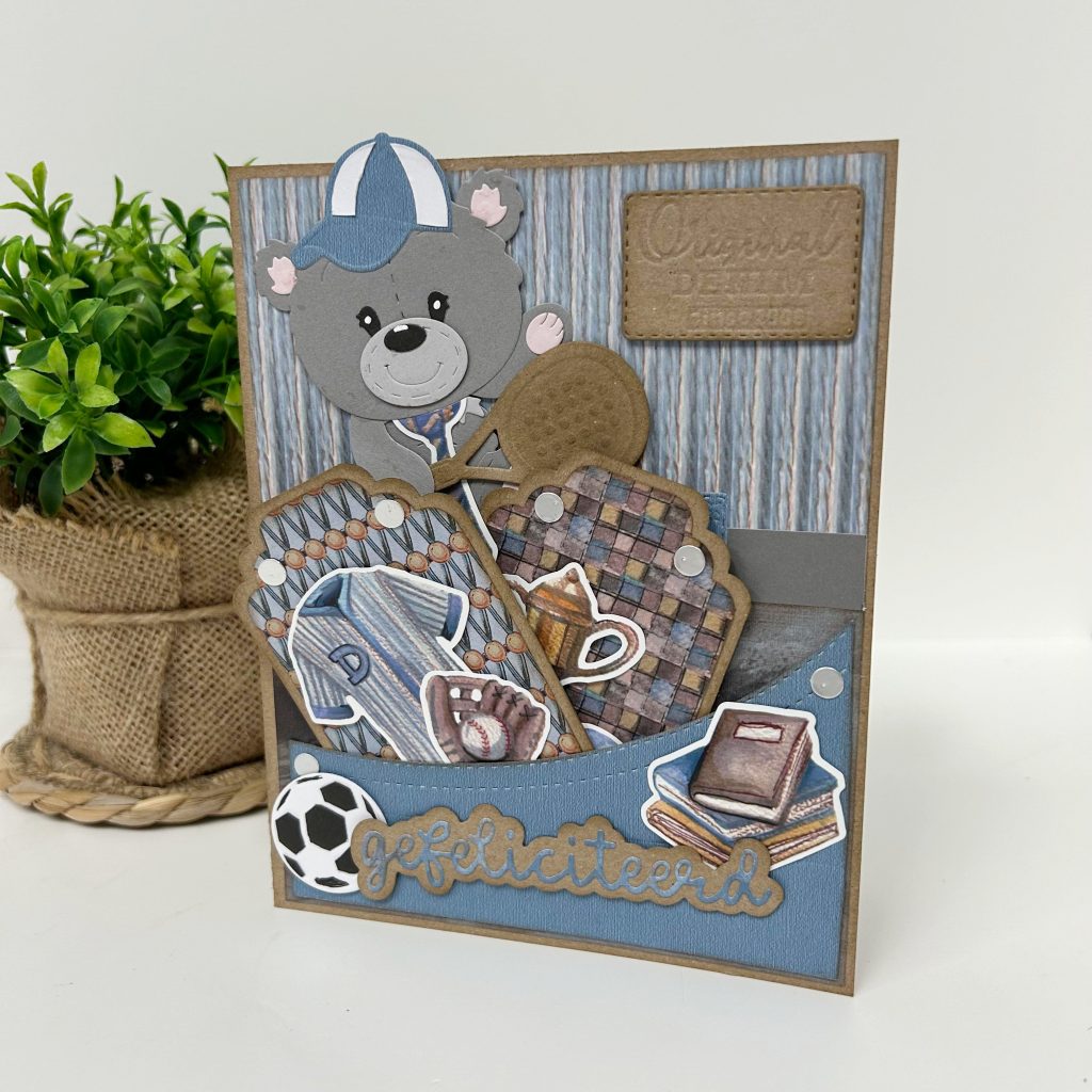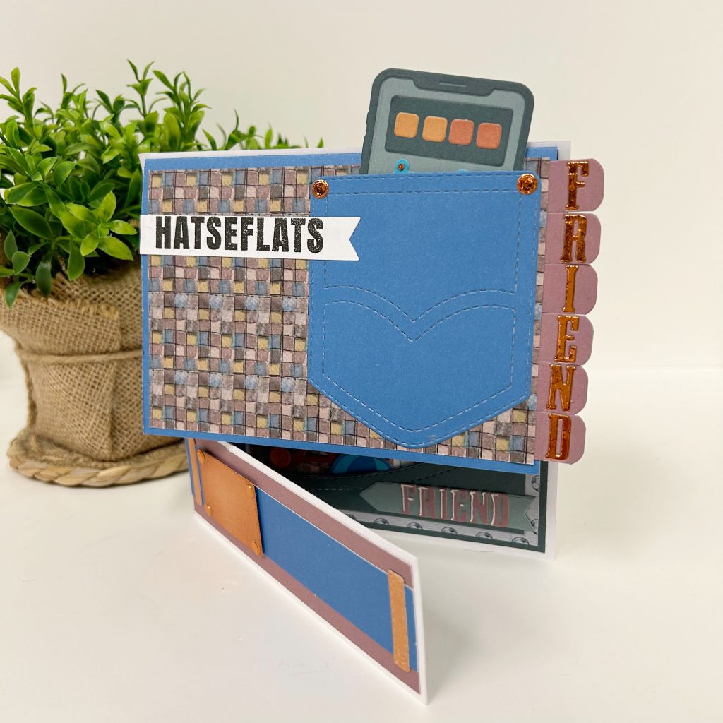 Ook Natalie heeft een live gegeven met deze goodiebag. Een stoere mannenkaart met de mal van de broekzak waaruit ze de stans van de telefoon uit de set laat steken.