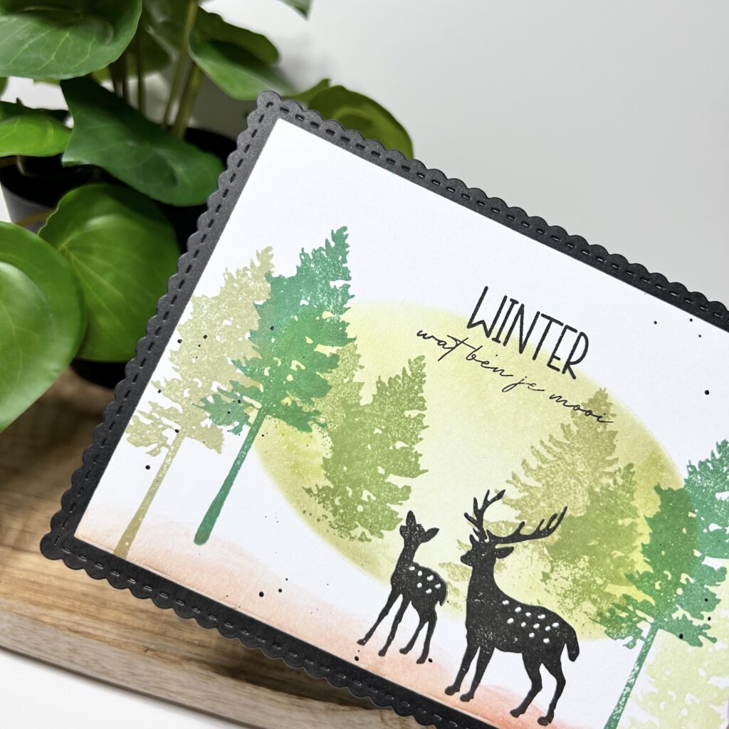 PanPastel kun je dan ook mooi met je stempels combineren zoals de stempelset winter van Bella Lulu. Zo kun je nog snel wat kerstkaarten maken mocht je er nog tekort komen. Er zijn verschillende kleuren ijn verkrijgbaar. Jolanda heeft bij de bovenste kaart gekozen voor 2 2 kleuren groen en bijpassende groene memento inkt.