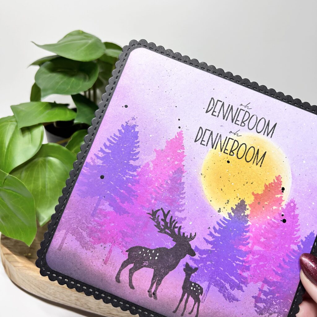 Ook bovenstaande kaart heeft ze paars en roze gecombineerd. Met de PanPastel blender kun je een mooie overloop maken tussen 2 verschillende kleuren zoals je ziet. En hierbij heeft ze de stempels met paars en roze inkt aangebracht. Als je klaar bent kun je met een fixatief spray je kaart met wat afstand sprayen dan geeft de PanPastel nauwelijks meer af.