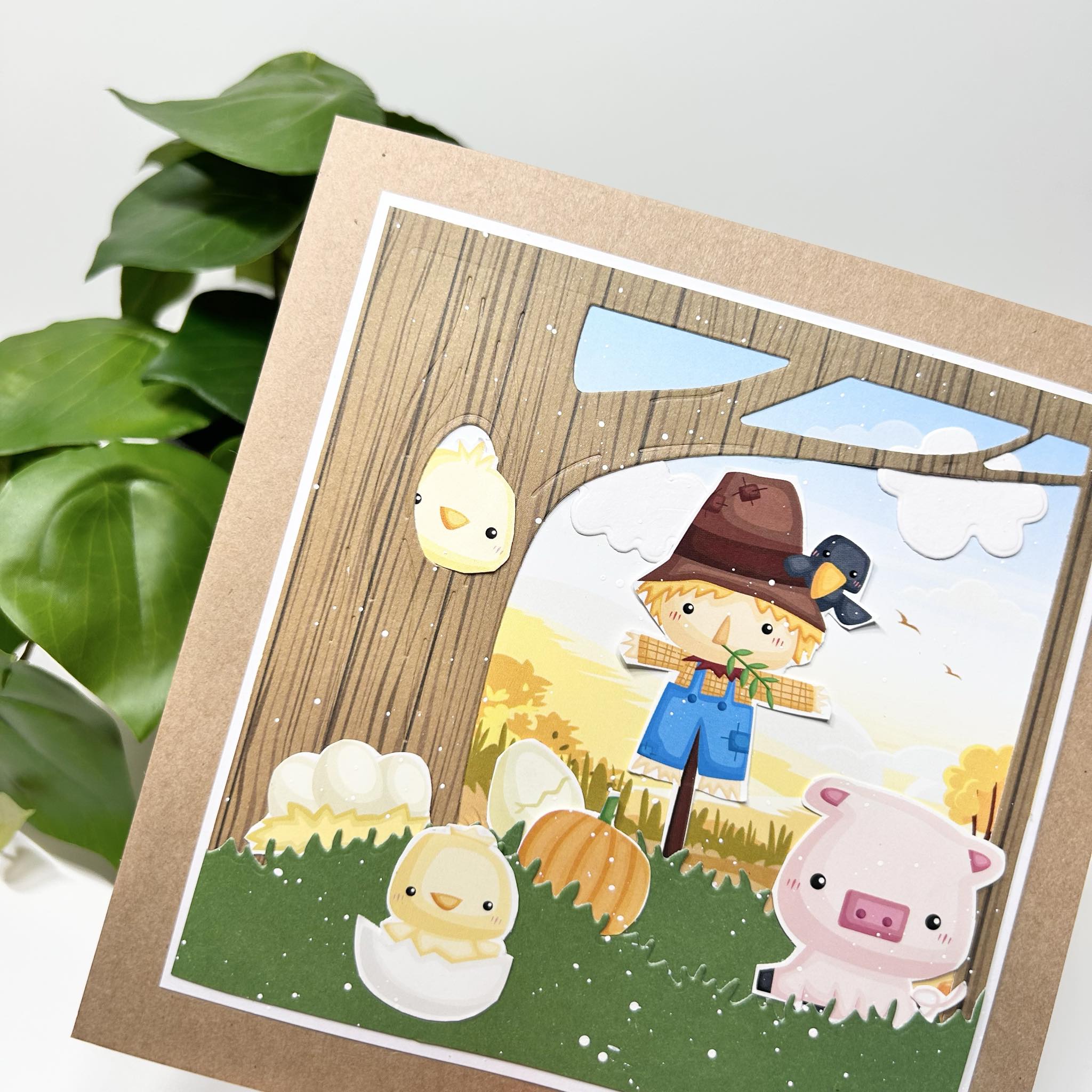 Jolanda heeft de passepartout mal gecombineerd met het achtergrondvel farm van Bella Lulu. Voor de basiskaart van de passepartout mal heeft ze een stuk designpapier met houtprintje gepakt van 12 x 12 cm. Wil je een bredere rand rondom je boom dan pak je een groter stuk designpapier en stans je de mal precies in het midden van je papier uit zodat je rand aan de 3 zijkanten even breed is. De basiskaart heeft Jolanda gemat op wit en kraft cardstock. De kaart heeft Jolanda aangekleed met plaatjes uit het knipvel op de boerderij van Bella Lulu.