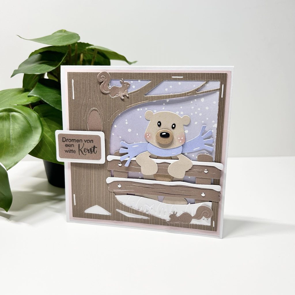 De passepartout mal kun je voor alle jaargetijden gebruiken dus ook voor de winter. In de winter accessoires van Eline zit dit leuke hek en daar past het ijsbeertje mooi achter. In plaats van gras heeft Anouk nu een sneeuwlaag gemaakt aan de onderkant van de boom. Brrr het is wel koud dus het ijsbeertje heeft maar een lekkere warme sjaal omgedaan. Voor de achtergrond heeft Anouk het designpapier Eline’s Winter dreams gebruikt.