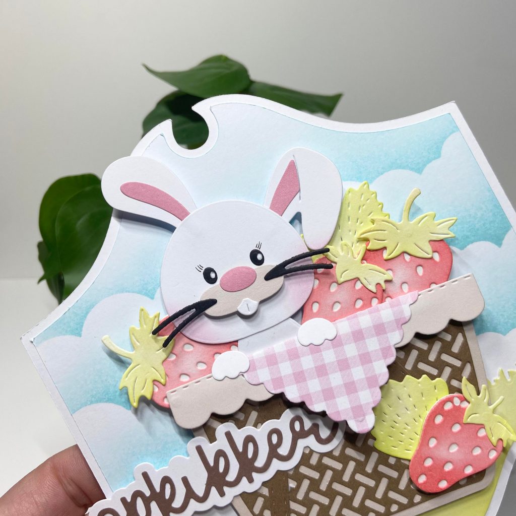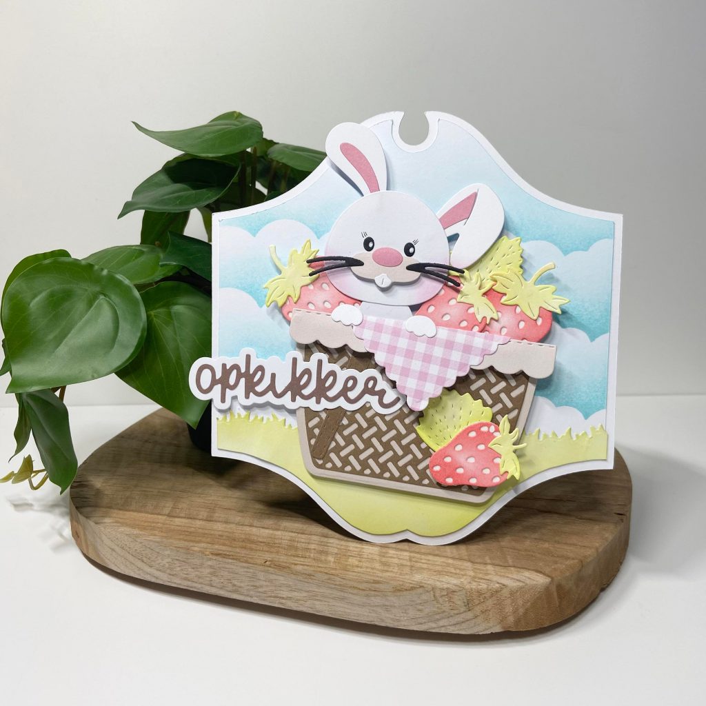 Ben jij ook al verliefd geworden op Benjamin, ons nieuwe konijntje uit de Friendz familie? Jolanda heeft hem deze keer verwerkt op dit kaartje. Hij gaat gezellig mee picknicken en zit verstopt tussen de aardbeitjes. De aardbeien zijn op kleur gemaakt met de inkten van Studio Light.
