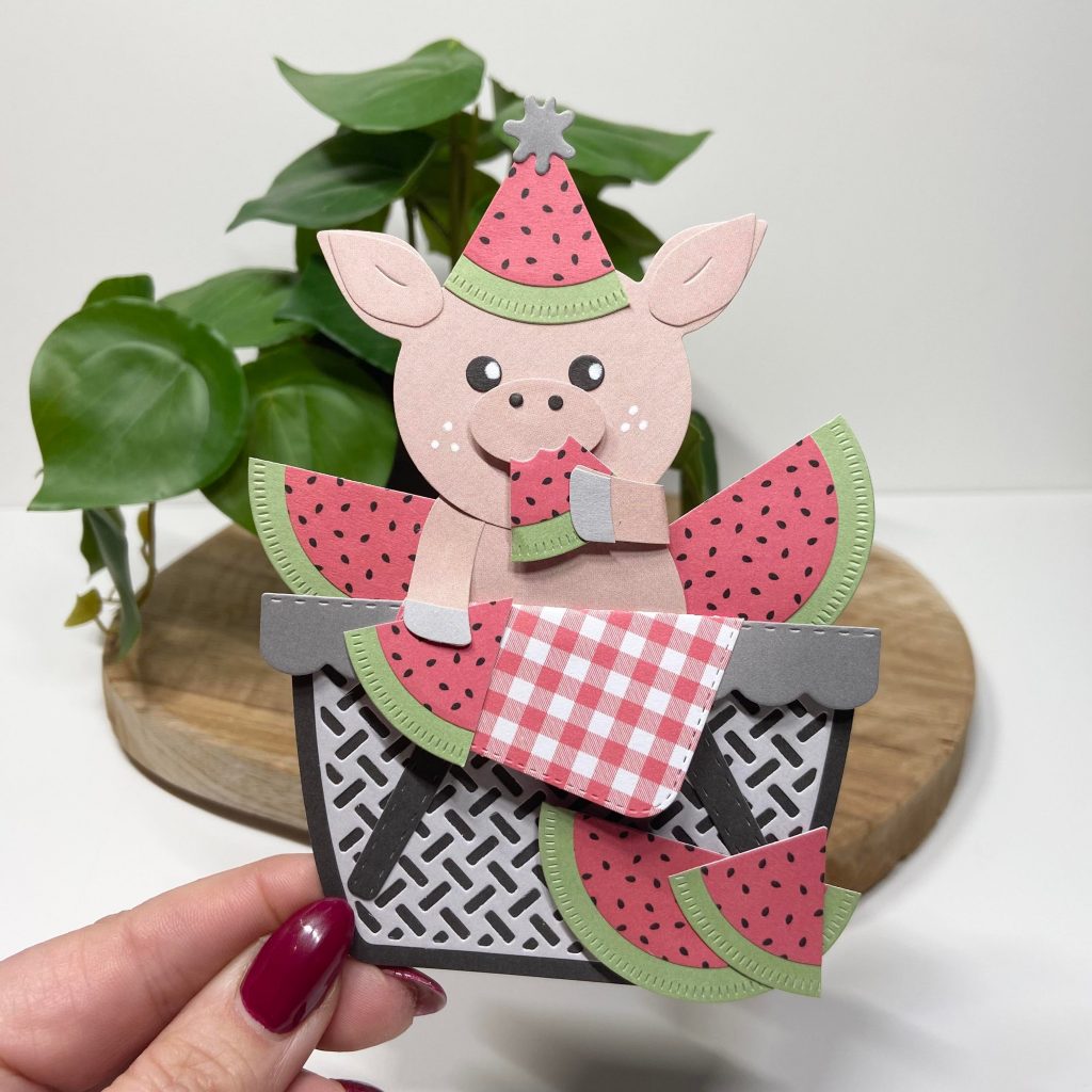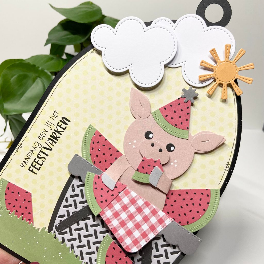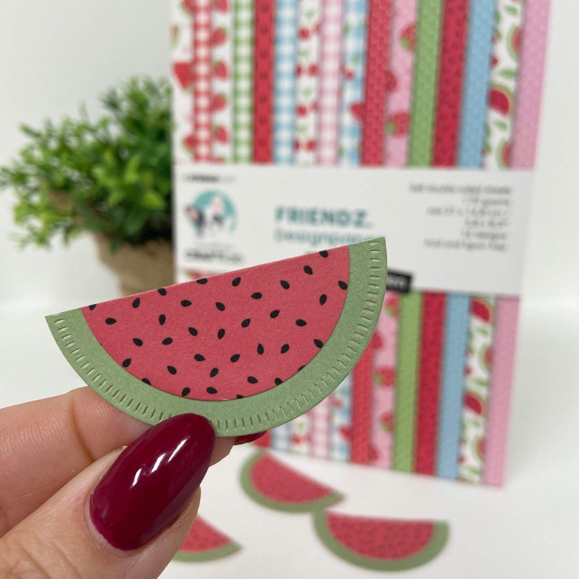 En tijdens de laatste CreativiTea demodag is Jolanda aan de slag gegaan met de cirkelstansen van CraftLab naar een ideetje van Judith. Met de printjes uit het nieuwe peperpad fruity garden kun je overheerlijke stukjes watermeloen maken. En daar houdt onze Frenkie wel van!