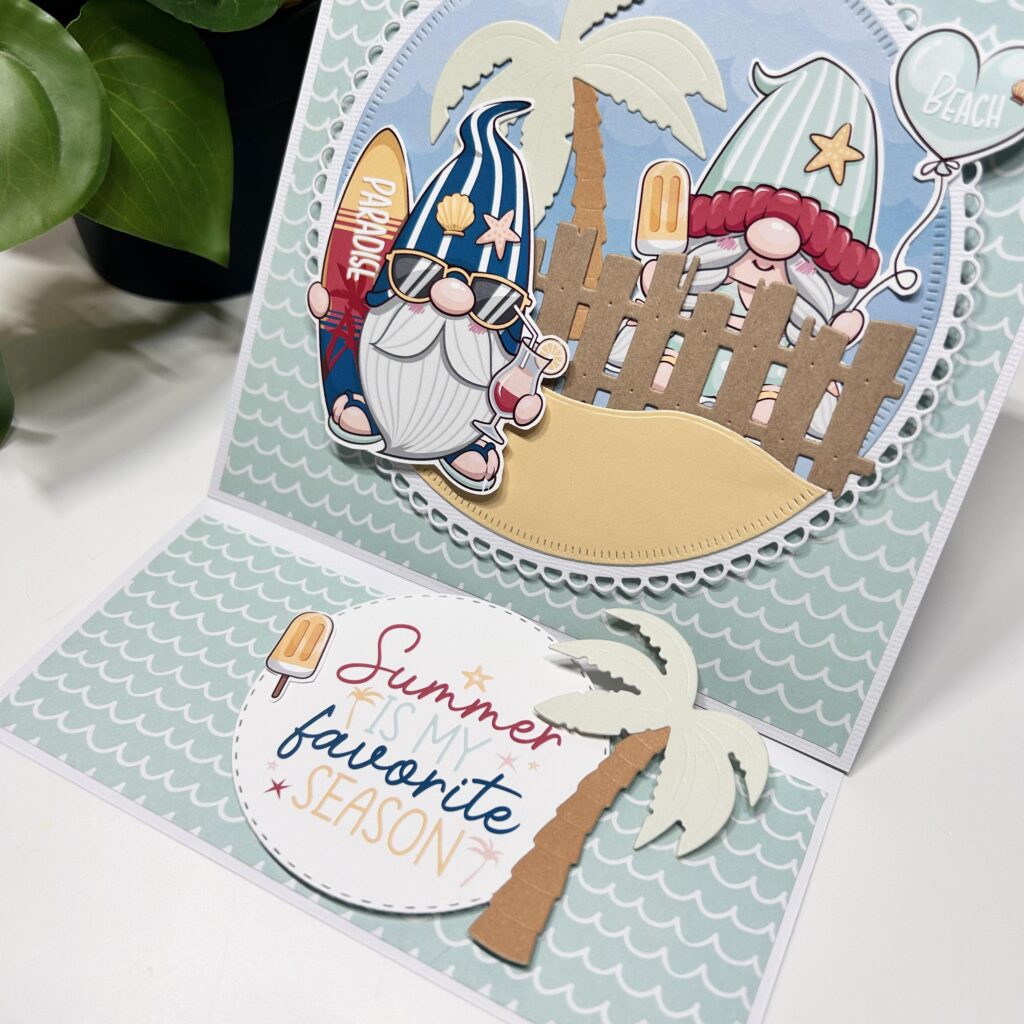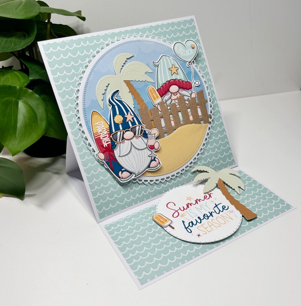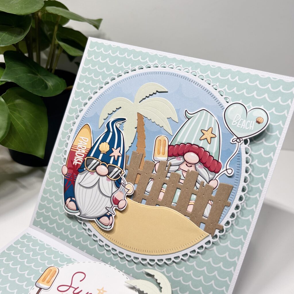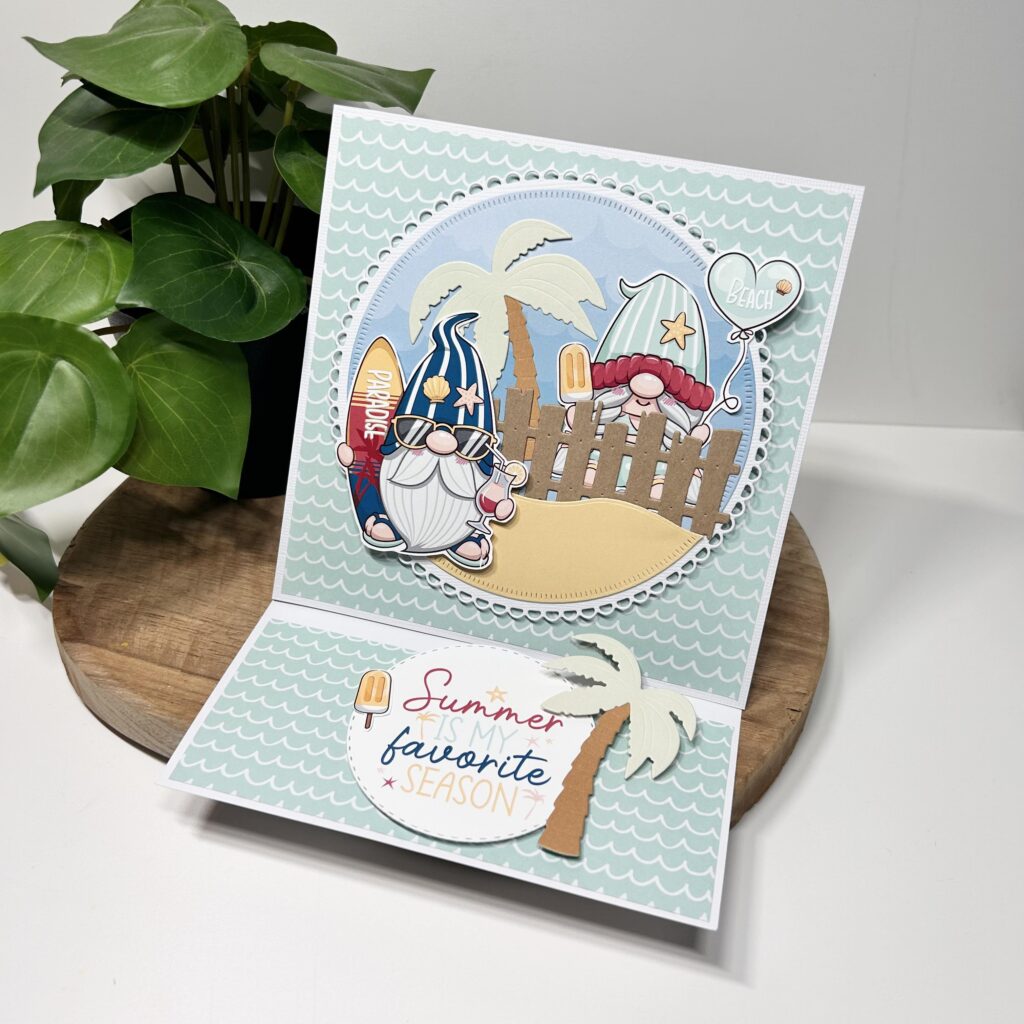 De hoofdrol op dit easelkaartje is voor deze stoere surfdude. In het nieuwe knipvel hello summer vinden jullie weer allemaal leuke Gnomes die klaar zijn om een dagje naar het strand te gaan. De ronde cirkelmal die Jolanda heeft gebruikt komt uit de nested cirkels van Craftlab. Het leuke hekje van Marleen past ook weer prima bij dit zomerse tafereeltje.