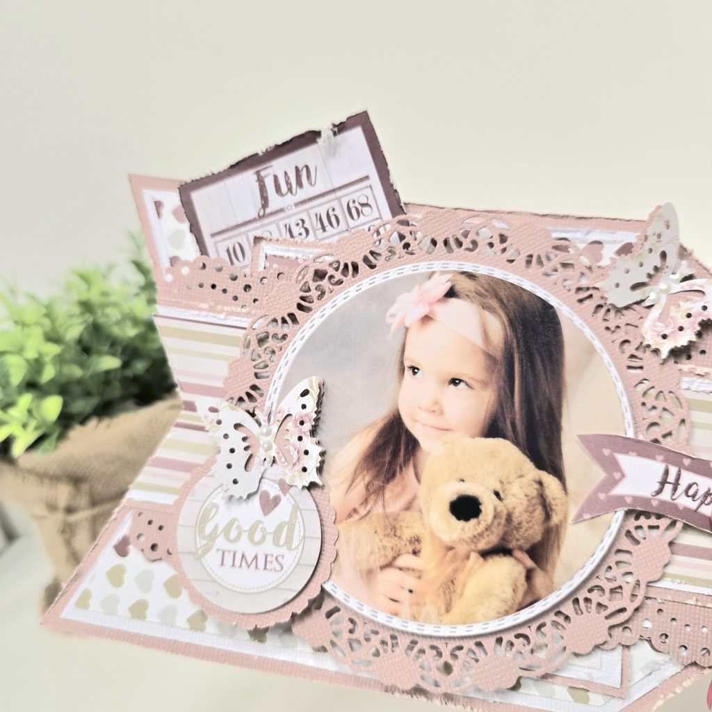 In de kit pink petals zit een papierset met plaatjes en teksten, een Dutch Doobadoo tekenmal, bloemen en nog een stansmal. Deze set shop je voor maar 27,99 zolang de voorraad strekt. Voor de basis van onderstaande kaart heeft Joyce de tekenmal van Dutch Doobadoo gebruikt die ook in de kit zit. Deze mal kun je in verschillende lagen opbouwen zoals Joyce heeft gedaan. Ook heeft Joyce de randjes van het cardstock en designpapier ruw gemaakt met een distress tool. Joyce bouwt haar vintage kaarten altijd graag in lagen op. In het midden van de kaart heeft Joyce de Elvira doily mal van CraftLab gebruikt. Door aan de bovenkant niet alles vast te plakken kun je de leuke tekstkaartjes nog achter de mal schuiven. De verschillende teksten komen ook uit de set pink petals net als het plaatje op de doily mal. Het plaatje en de matlaag op de doily heeft Joyce gestanst met de nested circles van CraftLab. De vlindertjes op Joyce haart kaart heeft ze gemaakt met een pons.