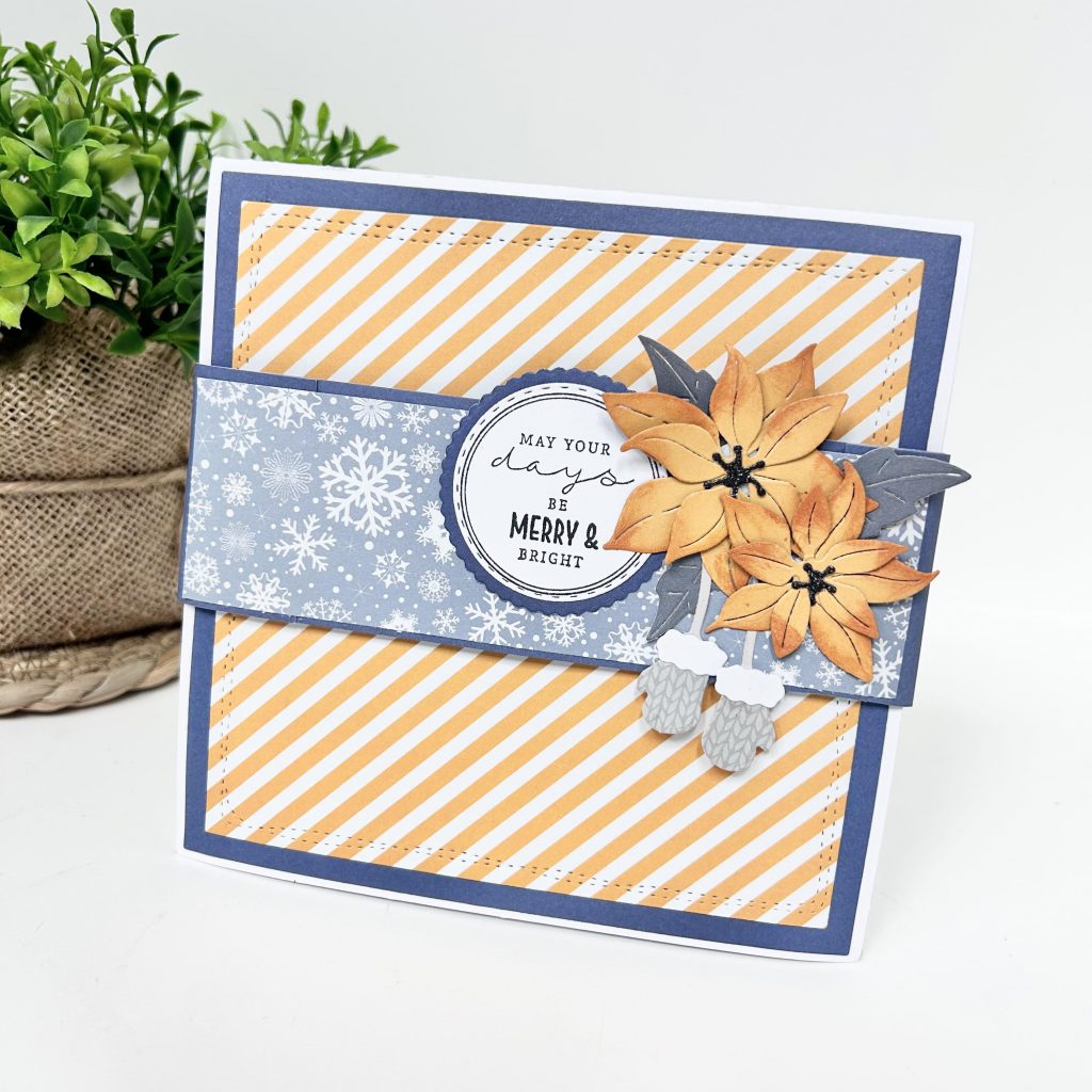 Rondom de dubbele kaart heeft Judith een banderol gemaakt die ze aangekleed heeft met een leuke tekst, de poinsettia en de winter stansen.