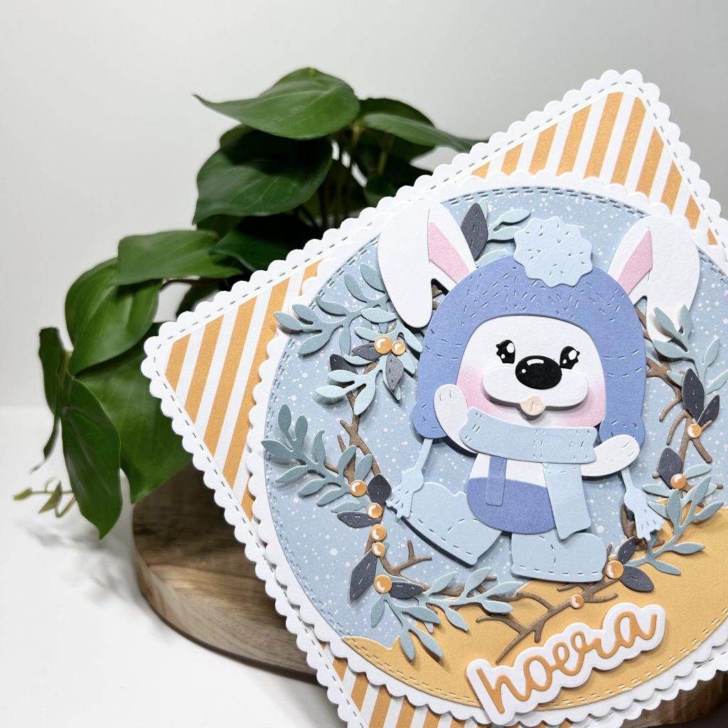 Ook op deze dubbele kaart van Judit komt Benjamin het konijntje voorbij. Hij gooit de kadootjes naar beneden vanuit het vliegtuig. In het CraftLab paperpad pawerful zit ook een heel leuk patroontje met wol en daaruit heeft Judith de muts en de sjaal gestanst.