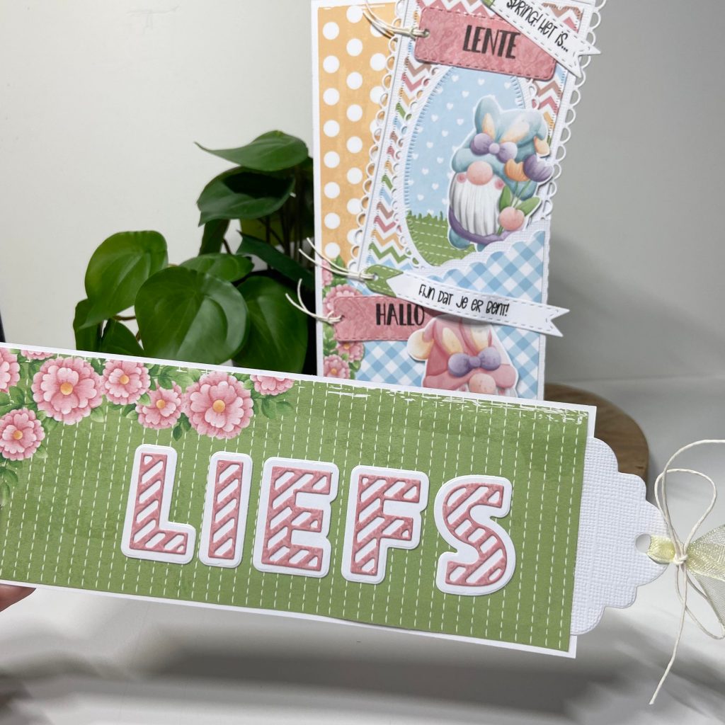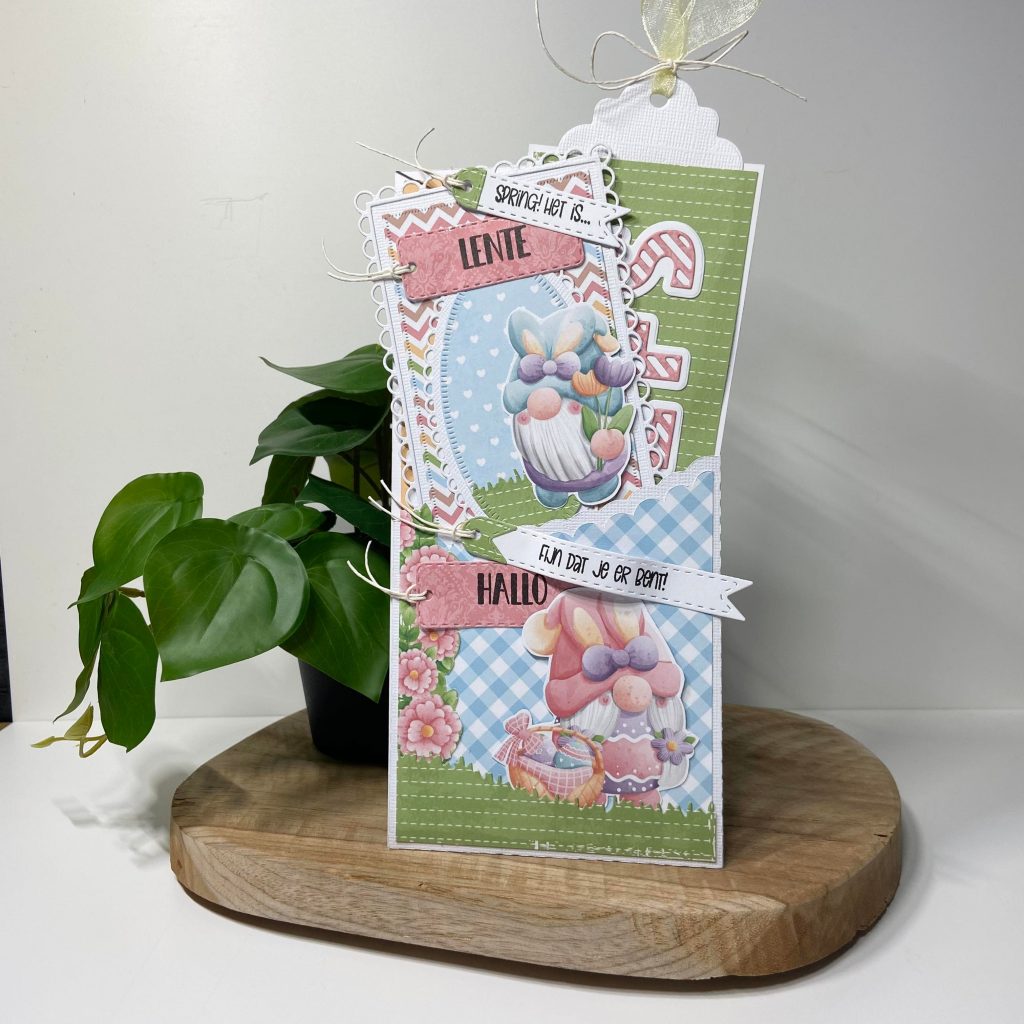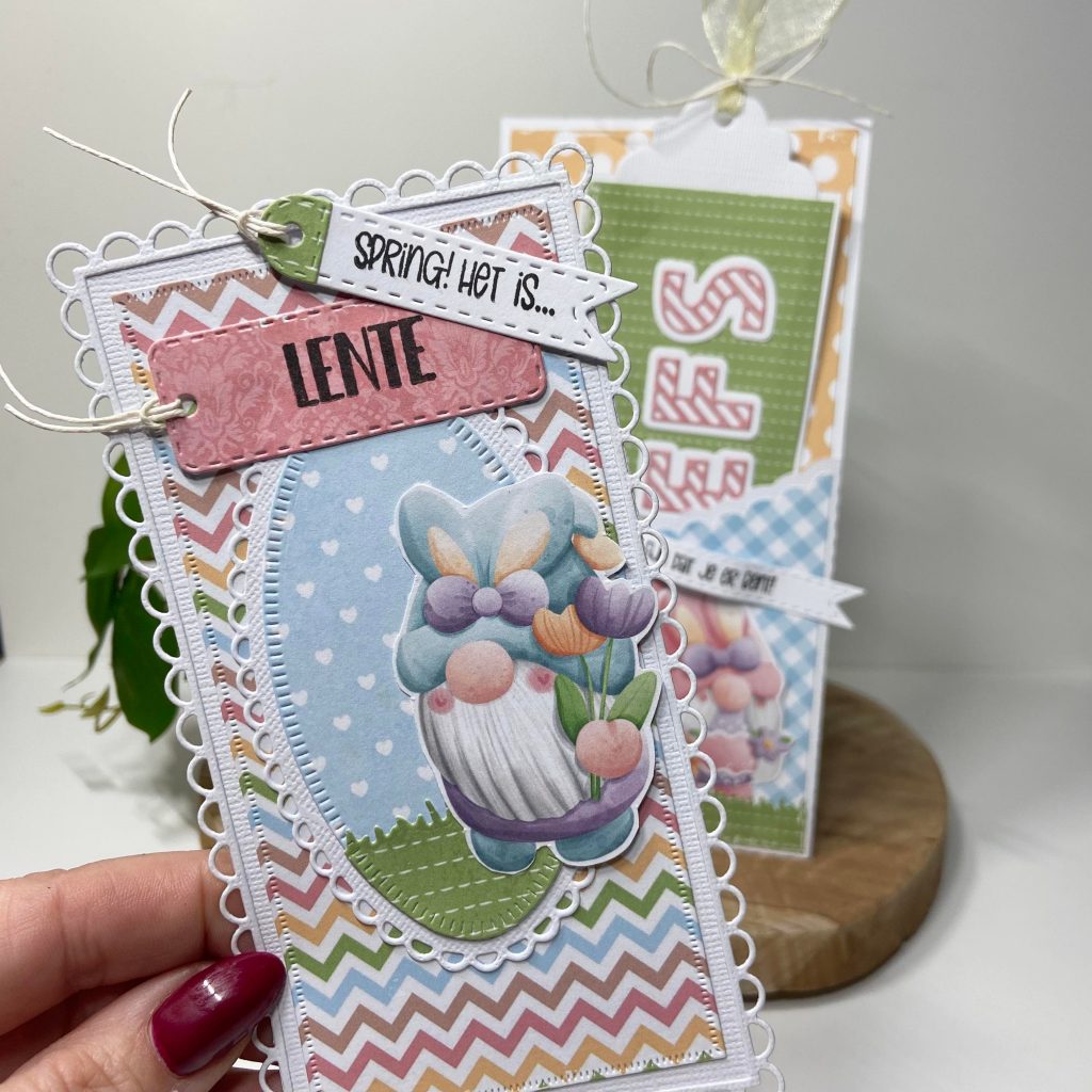 Jolanda heeft hiervoor de mini slimline stans van CraftLab gebruikt. Het papier en de plaatjes met de frisse voorjaarskleurtjes komen allemaal uit de Bella Lulu set lente in de lucht.