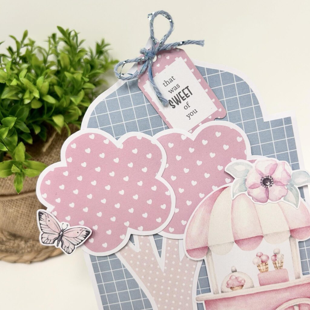 Voor haar laatste kaart heeft Mindy de bomen van Dutch Doobadoo gebruikt en deze een lekkere roze kleur gegeven. Dit past natuurlijk helemaal in het thema. Met plaatjes en een tekst heeft ze haar kaart afgewerkt.