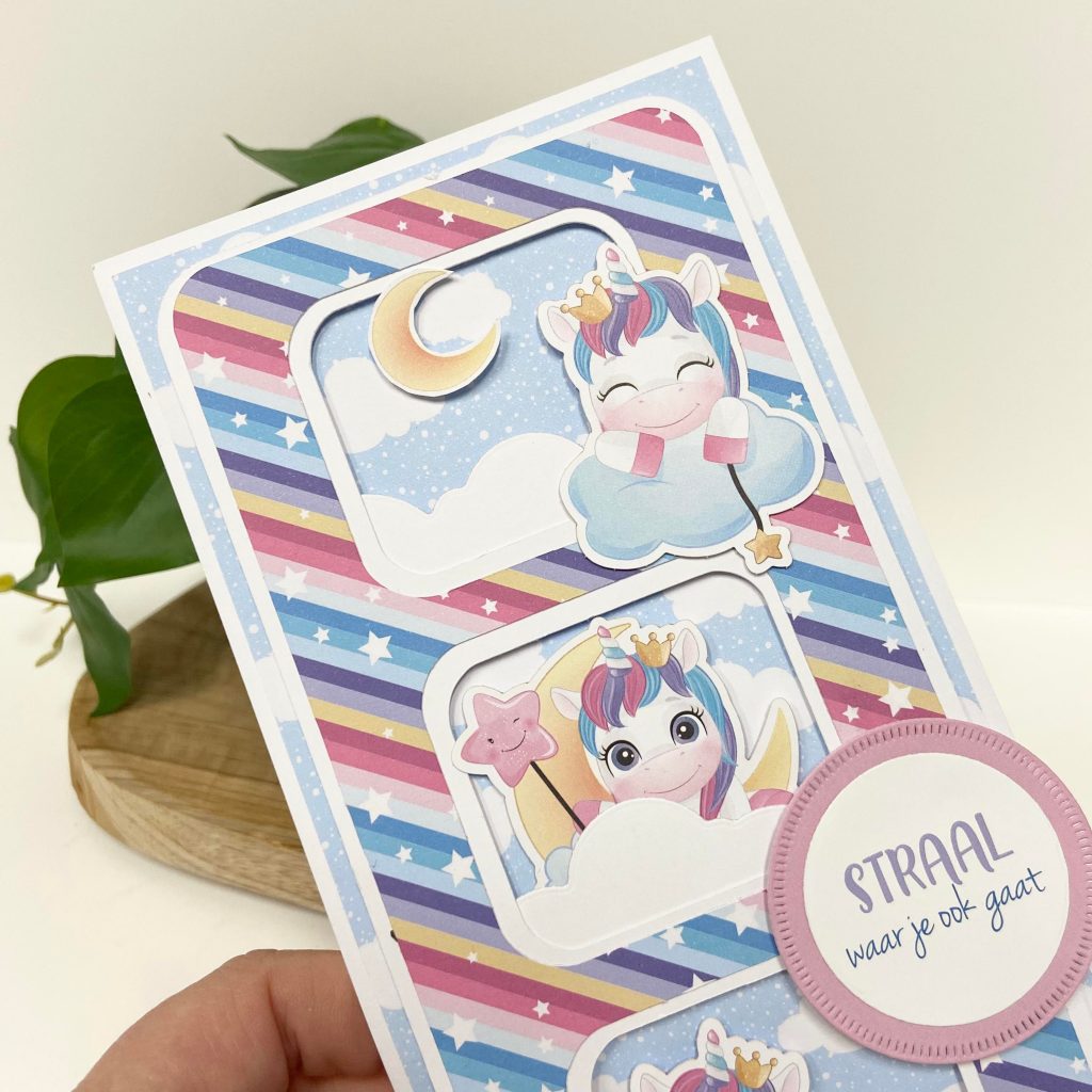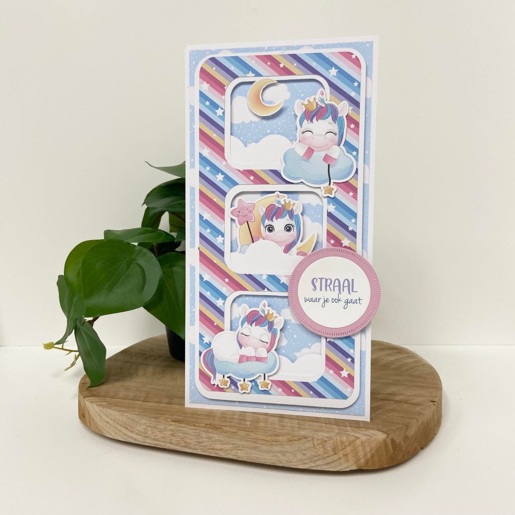We hebben bij deze online workshops een actiepakket voor jullie gemaakt en daarin zitten ook 2 slimline tekenmallen van Dutch Doobadoo. Jolanda heeft de eerste tekenmal uit het pakket gebruikt. Je maakt hiermee in een handomdraai een leuke kinderkaart met de bijpassende Crafty kit met unicorns. Hierin zit designpapier op slimline formaat en vellen met uitdrukplaatjes. Je hoeft dus lekker niet meer te knippen! Ben je snel door je plaatjes heen dan hebben we voor jullie ook nog een extra Bella Lulu knipvel gemaakt met unicorns en ook Nederlandse teksten om je kaart af te maken.