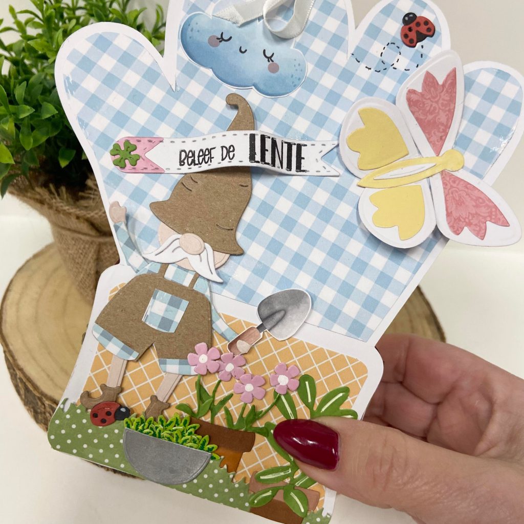 En in dit voorjaarstuintje mag de tuinman natuurlijk niet ontbreken. Deze heeft ze gemaakt met Carlos de gnome uit de CraftLab collectie.