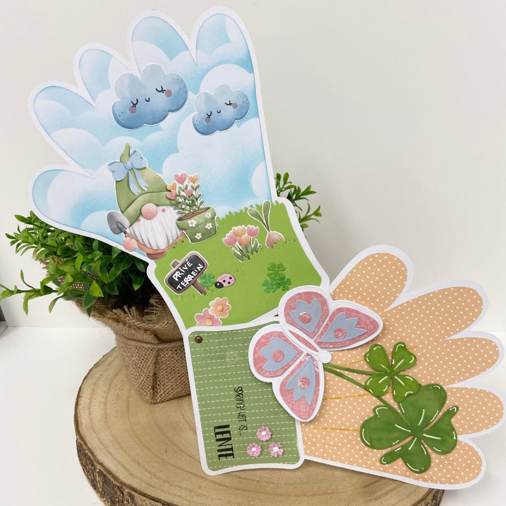 In deze blog ook nog een 2e kaartje dat Antoinette gemaakt heeft met deze leuke tekenmal. Ze heeft er een paar van tuinhandschoenen mee gemaakt, beiden op een andere manier opgeleukt. Het papier en de plaatjes komen uit de Bella Lulu papierset Lente in de lucht.