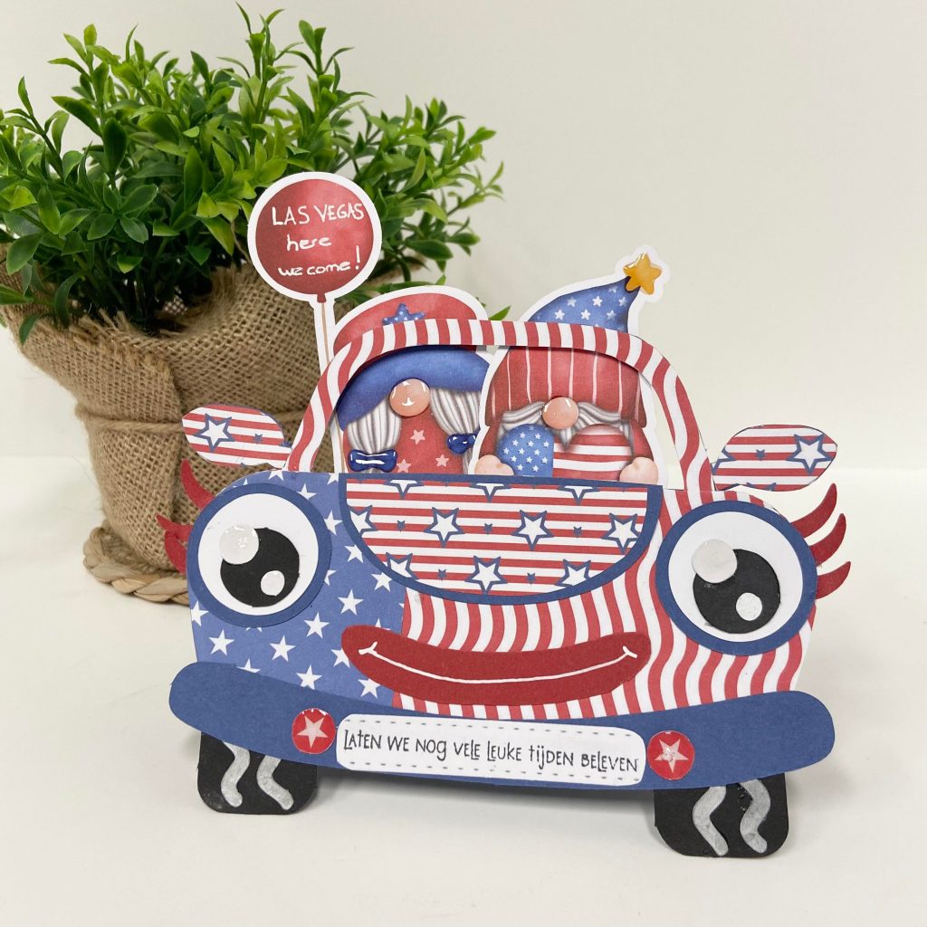 Antoinette heeft ook de onderstaande kaartje gemaakt met de Crafty Kit USA van Dutch Doobadoo. Voor het linker kaartje heeft ze de Build Up mal van de auto gebruikt. De leuke gnoompjes in de auto zijn uitdrukkertjes die in de Crafty Kit USA zitten. Voor het rechterkaartje heeft ze de nieuwe Card Art soda gebruikt. De hoed die Benjamin op heeft is gemaakt met de Friendz accessoires Notenkraker van Creative Craftlab. Alle kaartjes van de laatste demo van Anoinette staan natuurlijk weer bij ons in de winkel.
