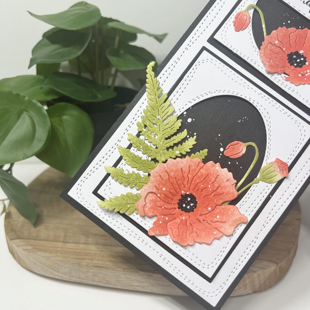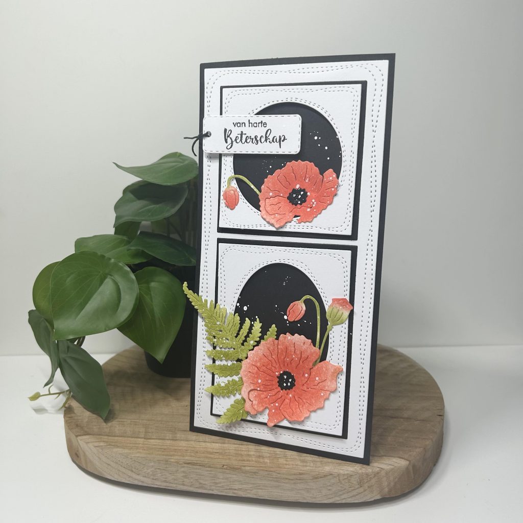 Afgelopen week heeft Jolanda deze kaart live gemaakt in onze Facebook groep. Ze is aan de slag gegaan met de nieuwe stansen van Marianne Design. De serie bestaat uit een blaasbloem, een klaproos en een varenblad.