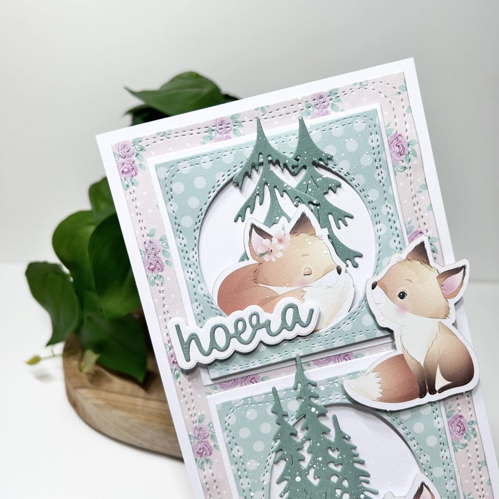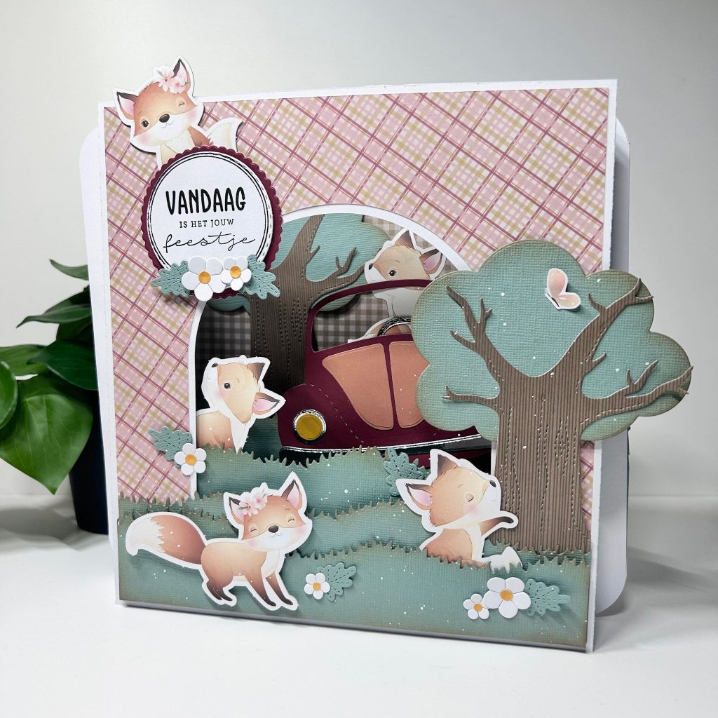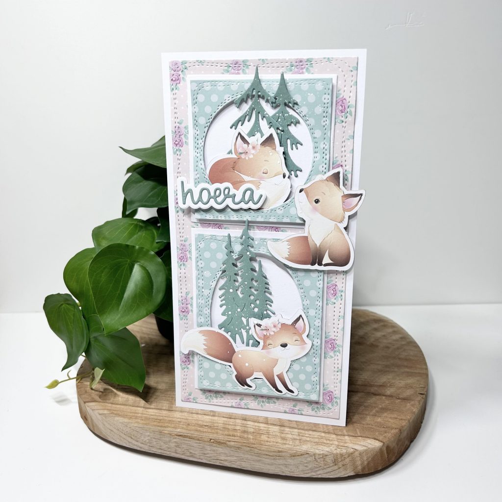 Een shadowbox is een soort doorkijkkaart dus het idee is dat je het bos inkijkt. Een vosje komt aangescheurd in de auto van CraftLab. Je kunt deze kaart overigens ook plat vouwen als je hem wilt versturen. Hieronder nog een tweede kaart van Jolanda deze keer op slimline formaat. In de set Little Fox zitten namelijk ook zoete designpapiertjes op slimline formaat.