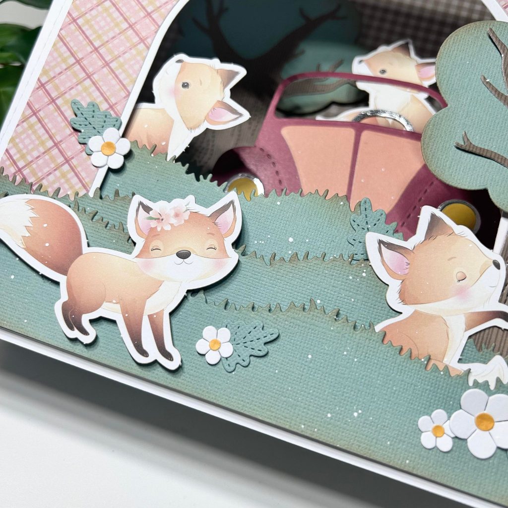 De kaart is aangekleed met het papier Hello Fall van Marianne Design. Deze kleurtjes passen weer perfect bij de vosjes uit de slimline paper set Little Fox. Op de voorzijde van de shadowbox is de nieuwe boom uit de collectie Woodland van Sweet Stories gebruikt.