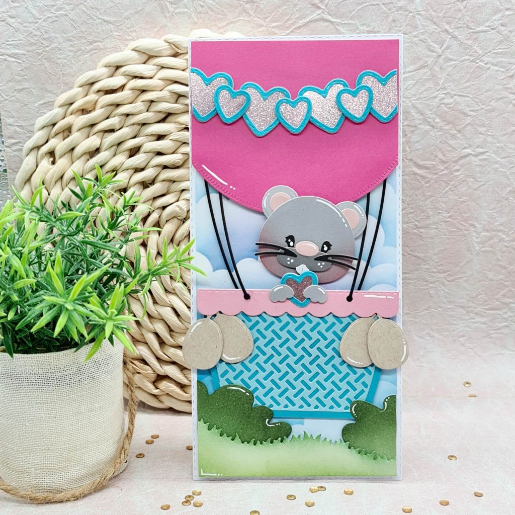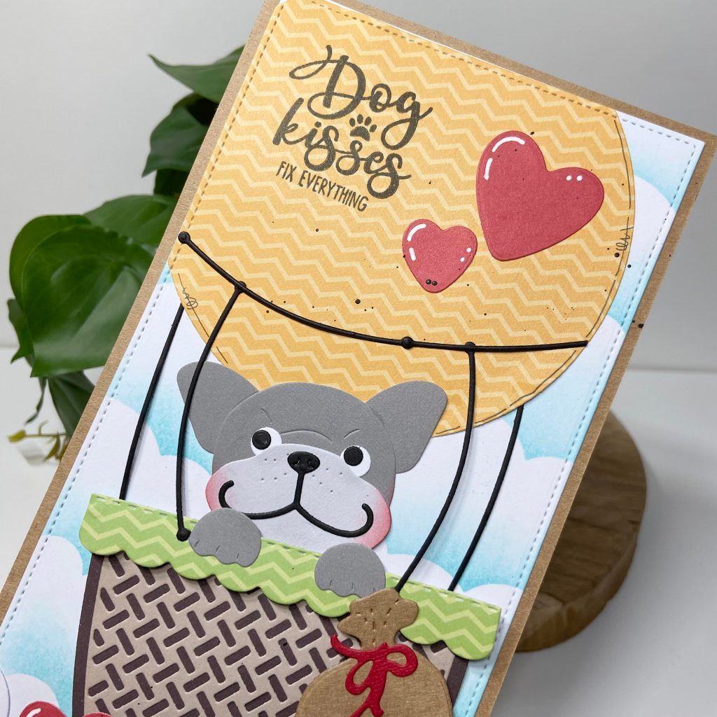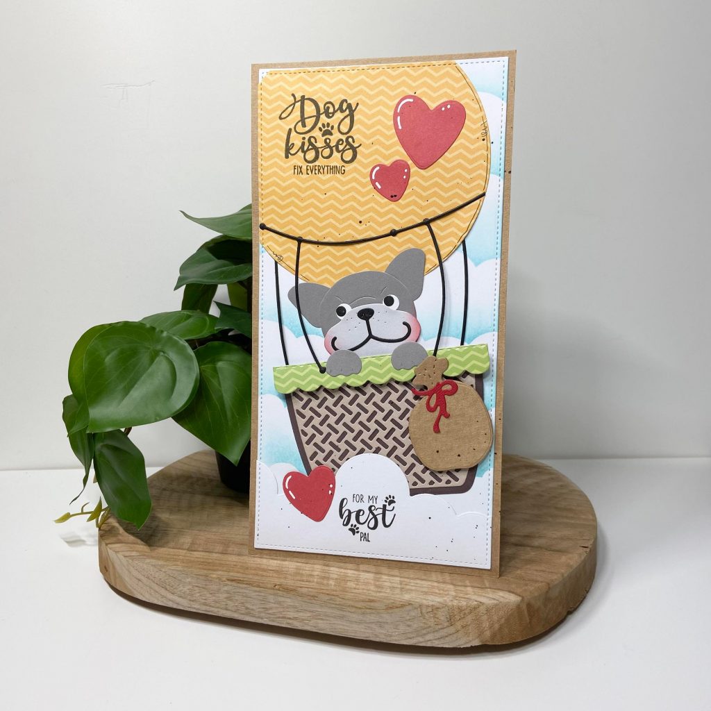 Voor de luchtballon kun je de cirkelstansen van CraftLab gebruiken. Jolanda heeft ervoor gekozen om onze stoere Buddy in het mandje te zetten. Hij gluurt als een echte avonturier over de rand van het mandje!