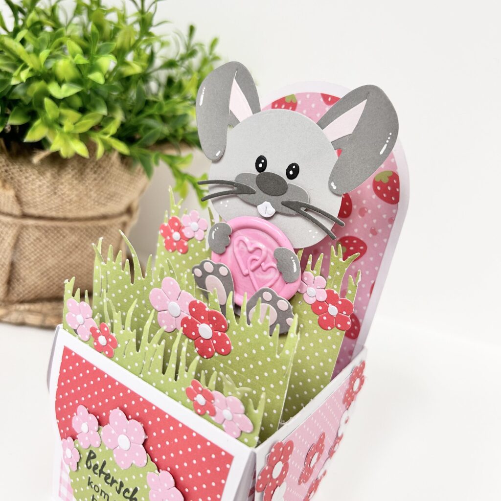 Voor onderstaande creatie heeft Gerlinde de nieuwe box art pop up mal gebruikt van Dutch Doobadoo die aan het eind van deze week in de winkel ligt. Het designpapier dat Gerlinde heeft gebruikt komt uit het craftlab paperpad fruity garden. Door in de box grasrandjes in verschillende hoogtes te maken krijg je nog meer diepte in de box en kun je hier een leuk tafereeltje in maken. Benjamin zit verstopt tussen het gras en wenst je wat extra liefde en beterschap. De wax zegel heeft Gerlinde gemaakt met een wax zegel van Carlijn Design.