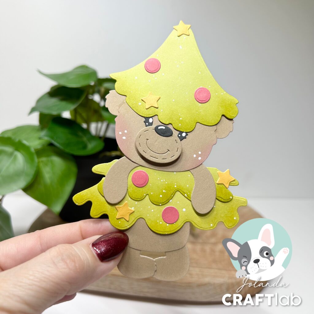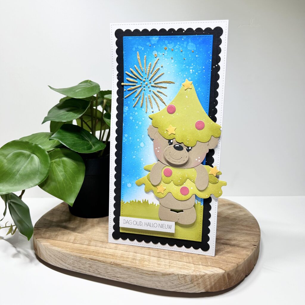 Is hij niet schattig onze Ted verkleed als kerstboom? Ook met hetzelfde vuurwerk op de achtergrond. Op beide kaarten heeft Jolanda de achtergrond gemaakt met de nieuwe Studio Light inkten. En heb je handige storage caddy al gezien? Hier kun je de inkten perfect in opbergen met je kleurenkaart en blendingbrushes.