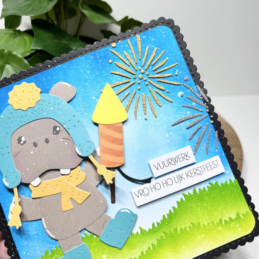 Het vuurwerk op de achtergrond is gemaakt met een Dutch Doobadoo slimline mask in combinatie met expanding mousse van Card Deco. Deze is in verschillende kleuren verkrijgbaar en Jolanda heeft de kleuren goud en zilver gebruikt.