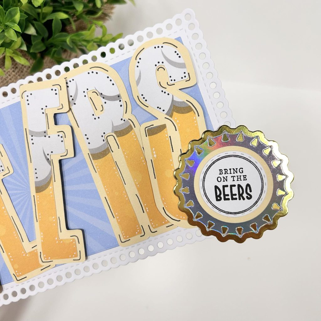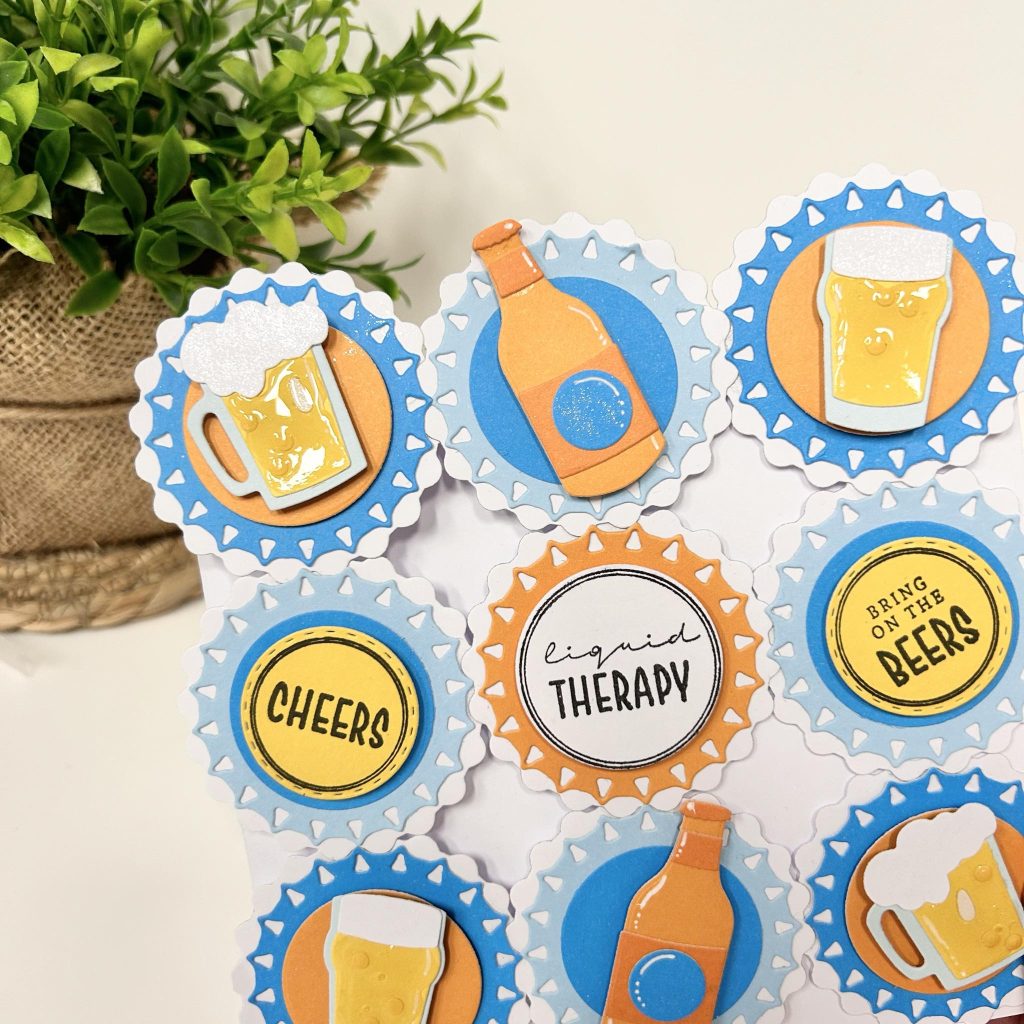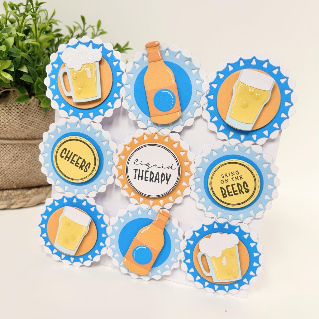 Onderstaand kaartje hebben jullie vast al voorbij zien komen. Chantal heeft de basis van haar kaart gemaakt met de beer caps. Deze heeft ze 9 keer gestanst en aan elkaar vastgemaakt. Kijk wat voor een leuk effect dit geeft. De verschillende kleuren cardstock komen uit het paperpad beer o”clock. Op de caps heeft Chantal verschillende teksten verwerkt die uit de Engelstalige stempelset komen en ze heeft verschillende glazen en flesjes bier gestanst die uit de nieuwe Friendz mal beer & wine komen. De bierglazen heeft Chantal een glanzend laagje gegeven met de 3D glossy effect van Studio Light.