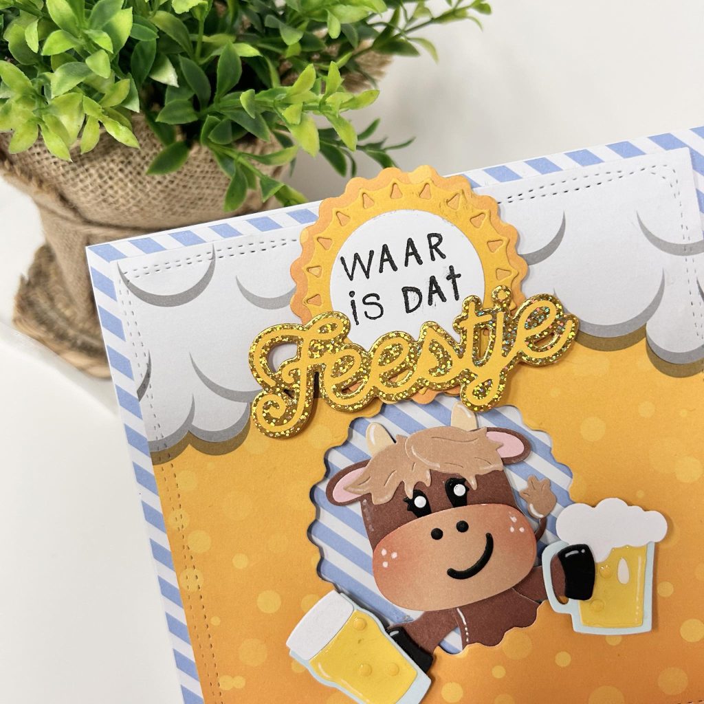 Chantal heeft een feestelijke kaart gemaakt met Koe Betty in de hoofdrol. Wist je dat je van ons Friendz diertje Betty ook een schotse hooglander kunt maken? Chantal heeft ervoor gekozen om de basis van haar kaart te maken met designpapier. Op het voorste designpapier heeft Chantal een opening gemaakt met de beer caps en hier heeft ze Betty uit laten steken met twee glazen bier in haar hand. De tekst heeft ze gestempeld op de beer caps. De tekst feestje is een nieuwe hotfoil mal van CraftLab en ontzettend leuk te combineren met de teksten uit de stempelset.