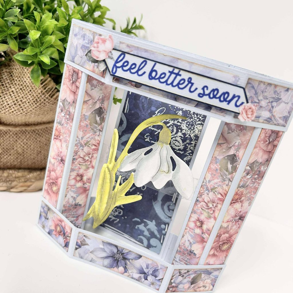 Thera heeft ook nog een hele mooie pilaren doorkijkkaart gemaakt. De blikvanger op haar kaart is de mooie bloem die bij de snowdrop mal zit. Thera heeft deze bloem ook met inkt op kleur gebracht. De tekst feel better soon zit in de stempelset feel better van Studio Light.